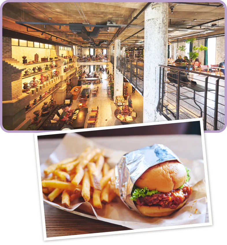 コーヒーにまつわるアンティーク器具が置かれた広い店内の「スローウォーク・コーヒー・ロースターズ」は、ハンバーガーはじめチキンカツ・トーストなど軽めのメニューが充実