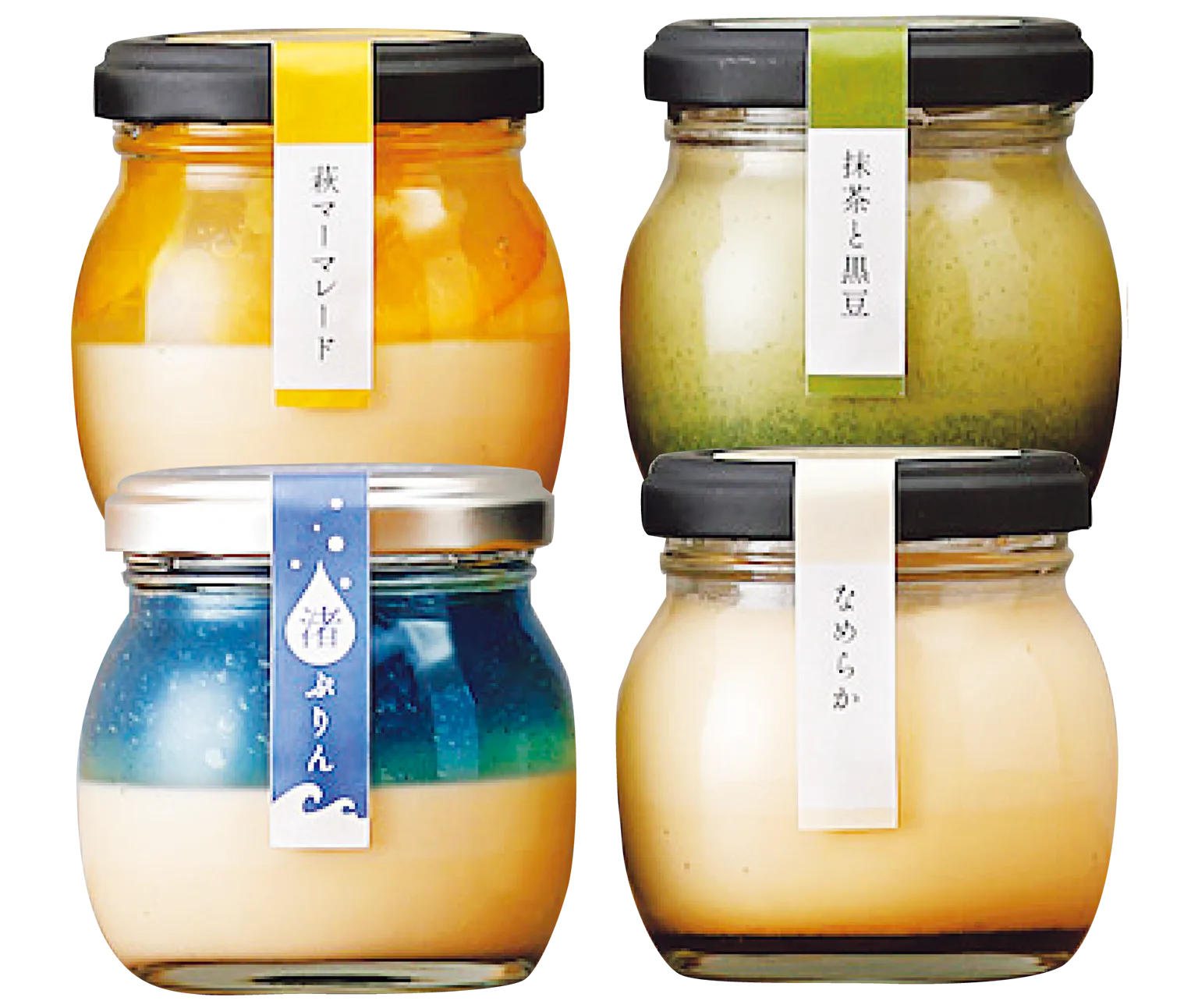 クリームのような、なめらかでとろける食感がくせになる定番商品。なめらか(手前右)、渚ぷりん(手前左)、抹茶と黒豆(奥右)、萩夏みかん(奥左)