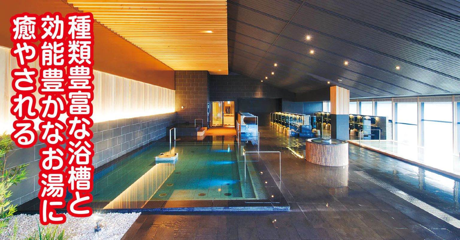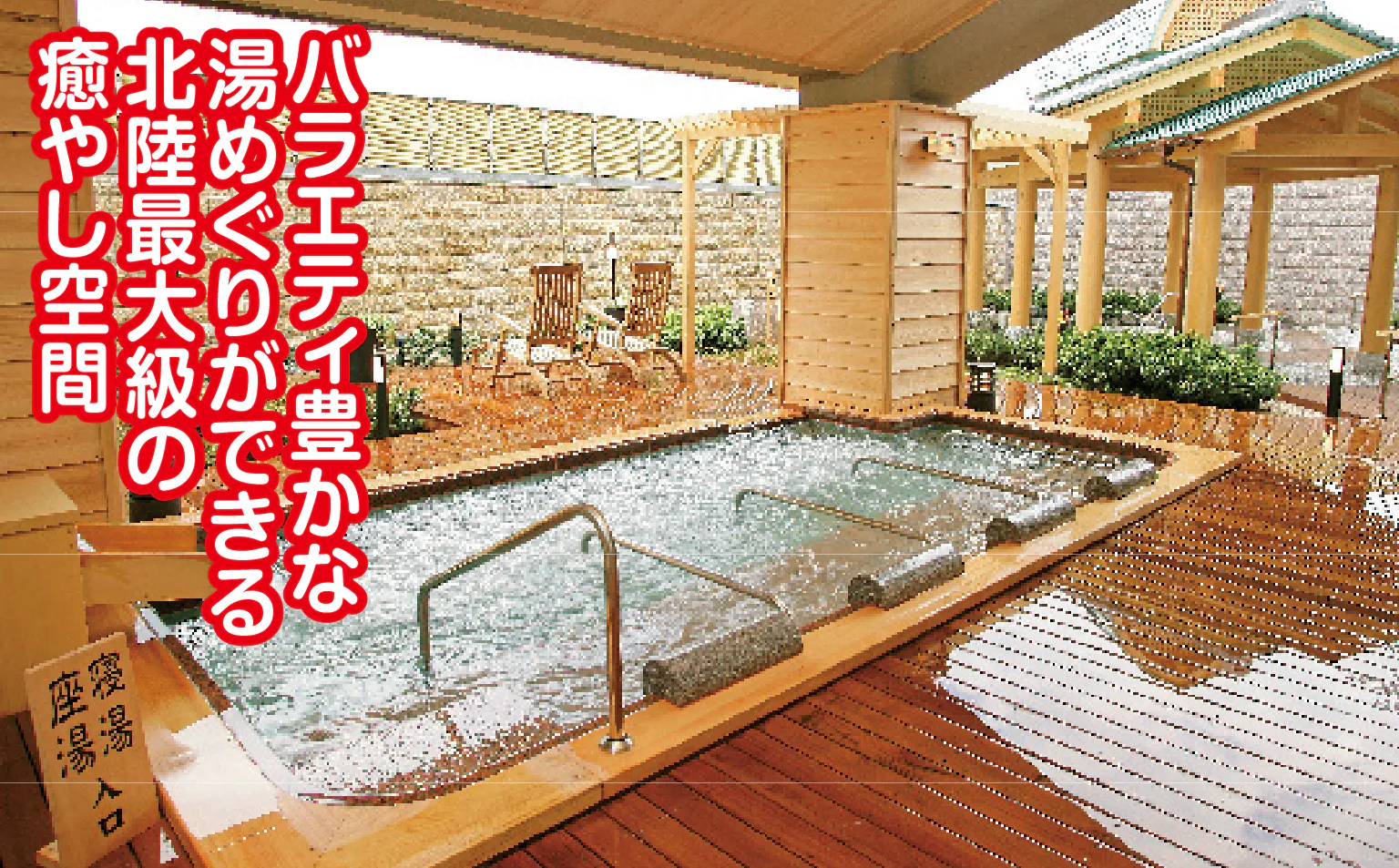 男性5種、女性7種の豊富な種類の湯船があり、湯めぐりを楽しめる。源泉大浴場露天風呂「千のこぼれ湯」は約500坪の広さで北陸最大級のスケール。無料の温泉卵作りコーナーなどの楽しみも。