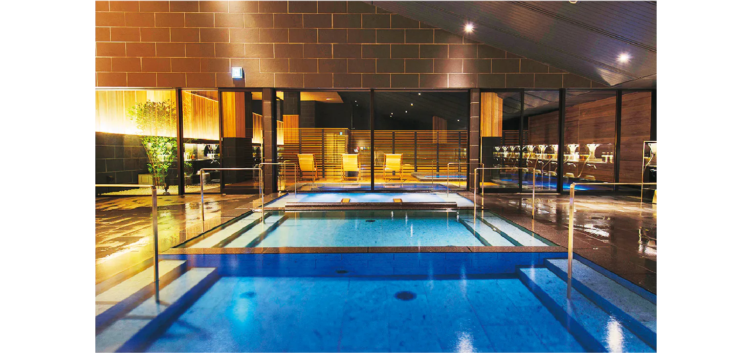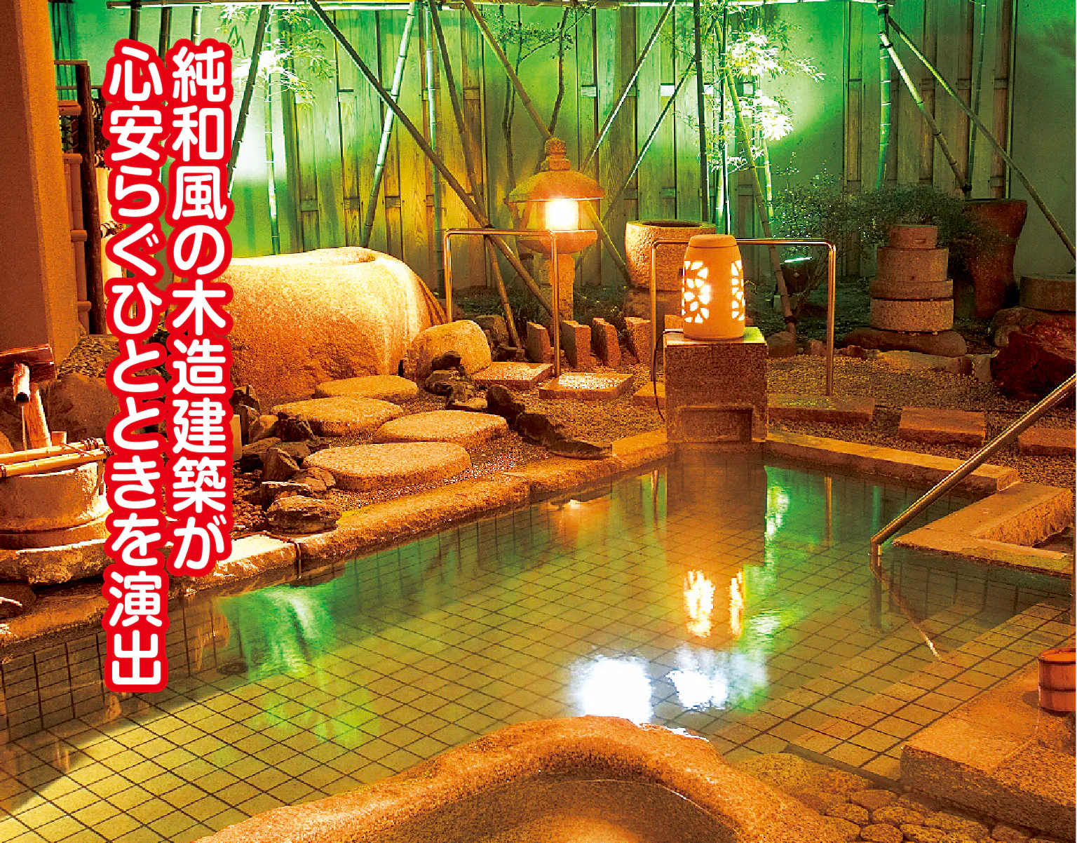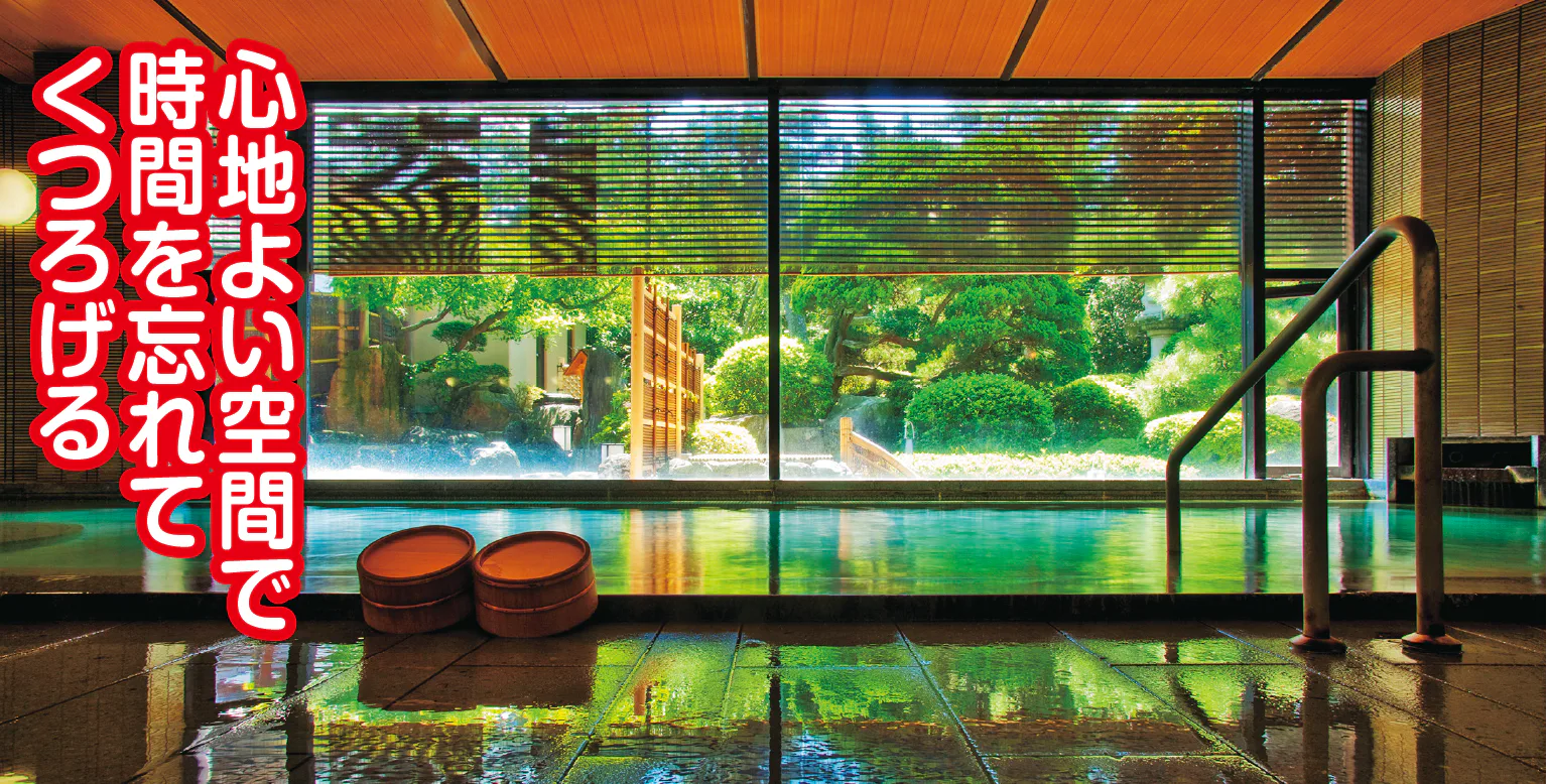 大風呂のほか、寝湯や檜風呂など湯船の種類も豊富で湯めぐりを楽しめる。