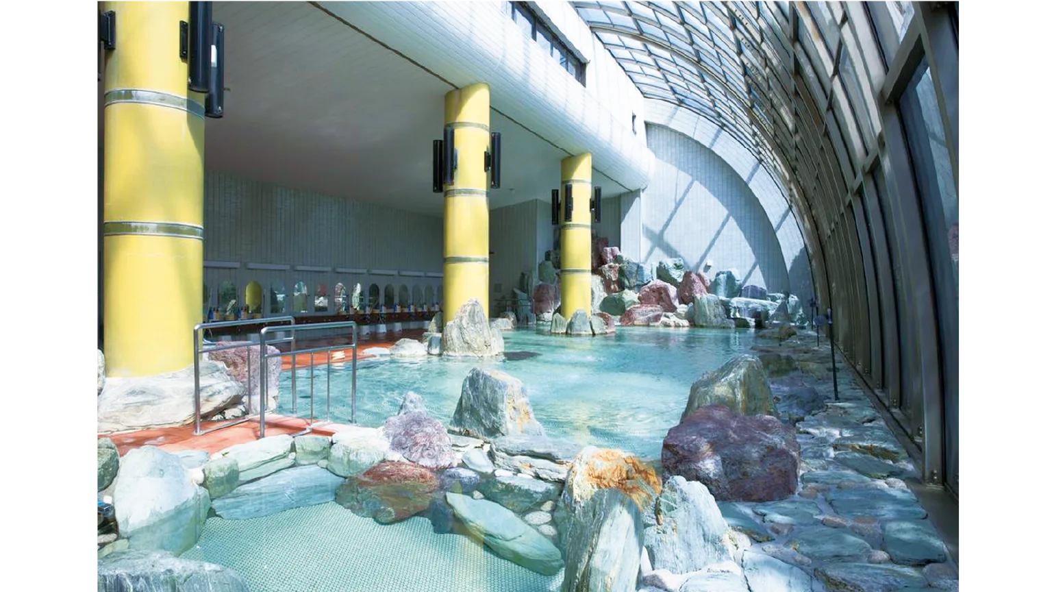 大浴場「太陽殿」(男女入替制)。戸外には庭園露天風呂も