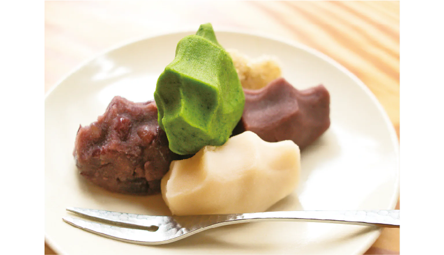 注文が入ってから手で握って仕上る高麗餅5個800円。味は、こし餡、抹茶、ごまなど。みやげはもちろん店内喫茶コーナーでも人気の名物。