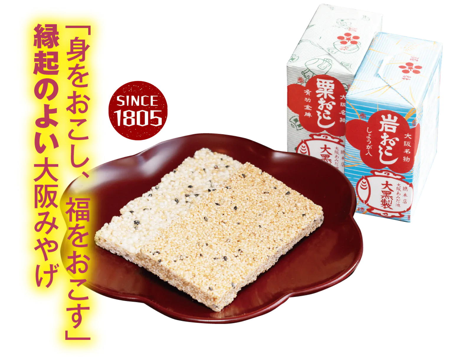 200年以上にわたって作り続けられている定番の米菓子。生姜入りの岩おこしと、食感軽やかな粟おこしは大阪が誇る伝統菓子だ。柚子や梅しそ味のセット・浪の詩や、洋素材とコラボするpon pon Ja ponなども人気。本店は創業の地でもある長堀川畔あみだ池に店を構えている。