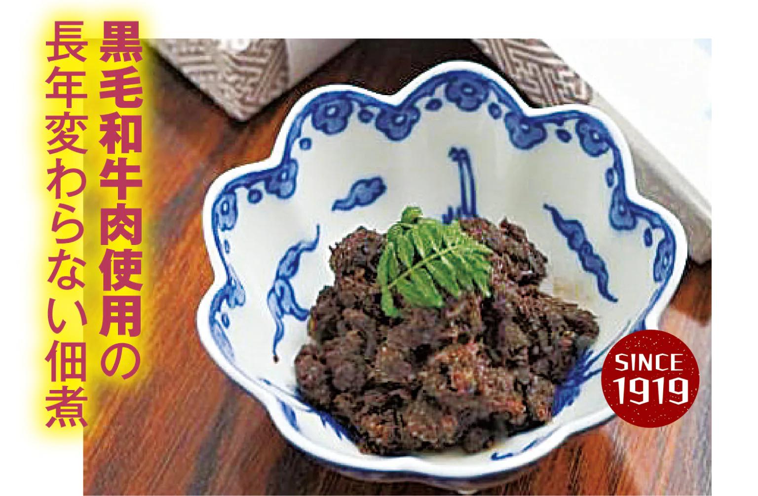 肉料理店と精肉店を併設する名店の贈答用定番商品。和食の料理職人が黒毛和牛の雌牛にこだわった肉を熟練の技で佃煮に。肉そのもののうま味はもちろん、ほろりとした食感も品があり美味。御堂筋沿いにどっしりと店を構える肉の名店。