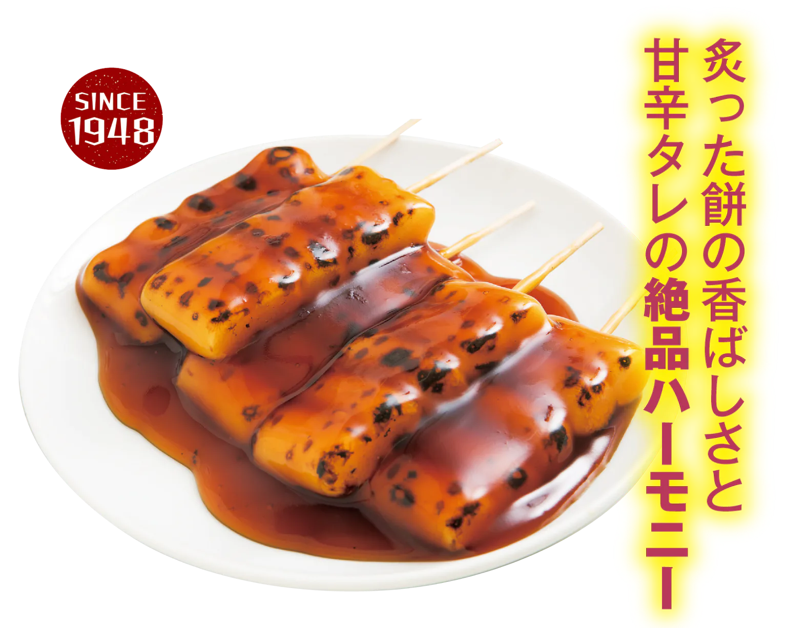 注文を受けてから直火で炙る餅と、昆布だしが隠し味の特製甘辛タレが特徴のみたらし団子。円筒状の餅の形は、香ばしい焦げ目を付けやすくし、そして、タレの絡みをよくするために考案されたスタイル。金色のしめ縄をあしらった巨大看板が目印。