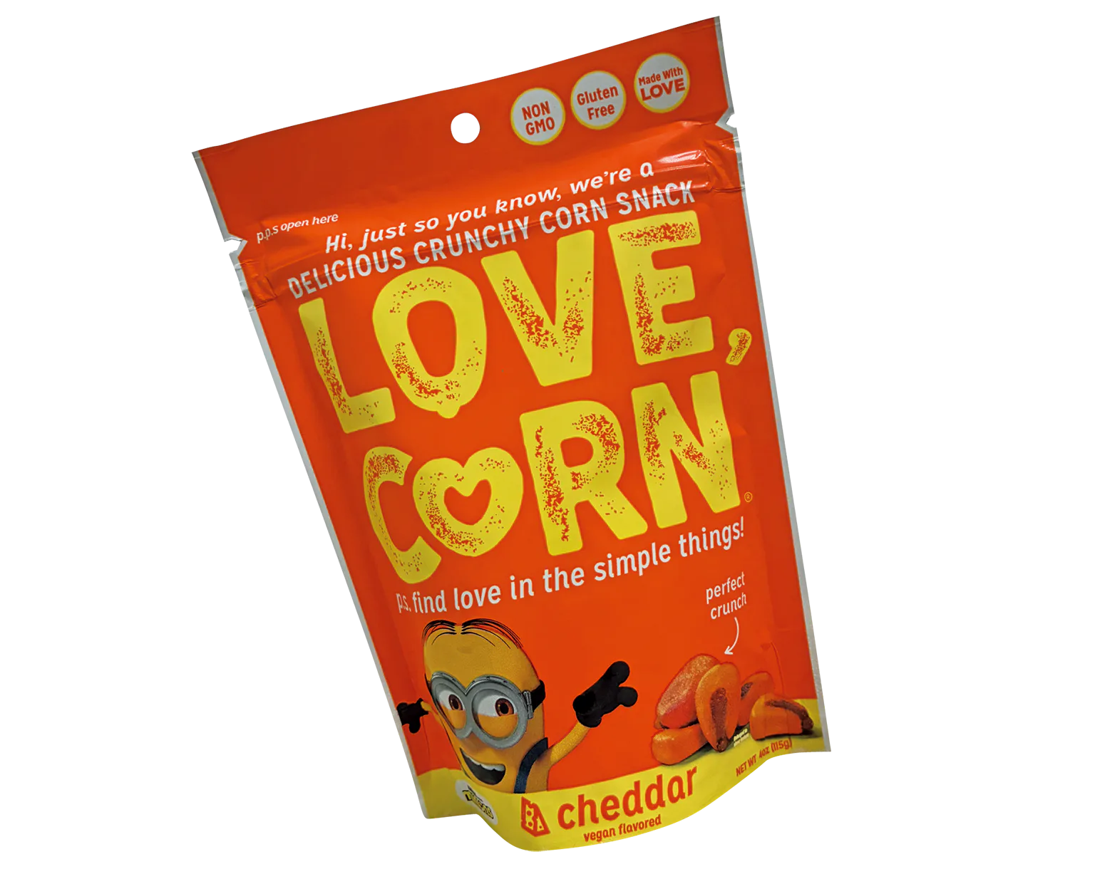 ミニオンズのイラストが描かれたチェダー味のカリカリ風味がやみつきになるコーンスナック