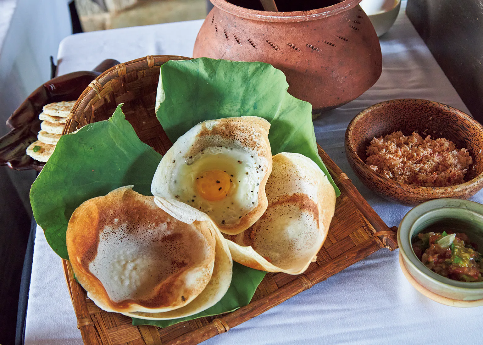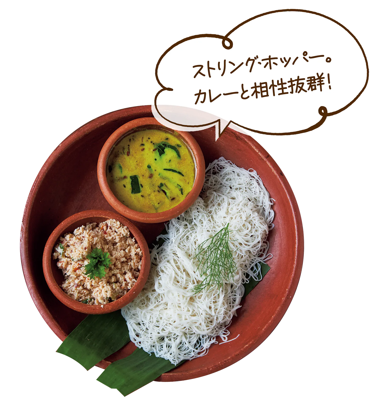細長いタイプの米が主流。小麦粉から作る薄く丸いクレープのようなホッパーや、ストリング・ホッパーという米麺が主食になることも。