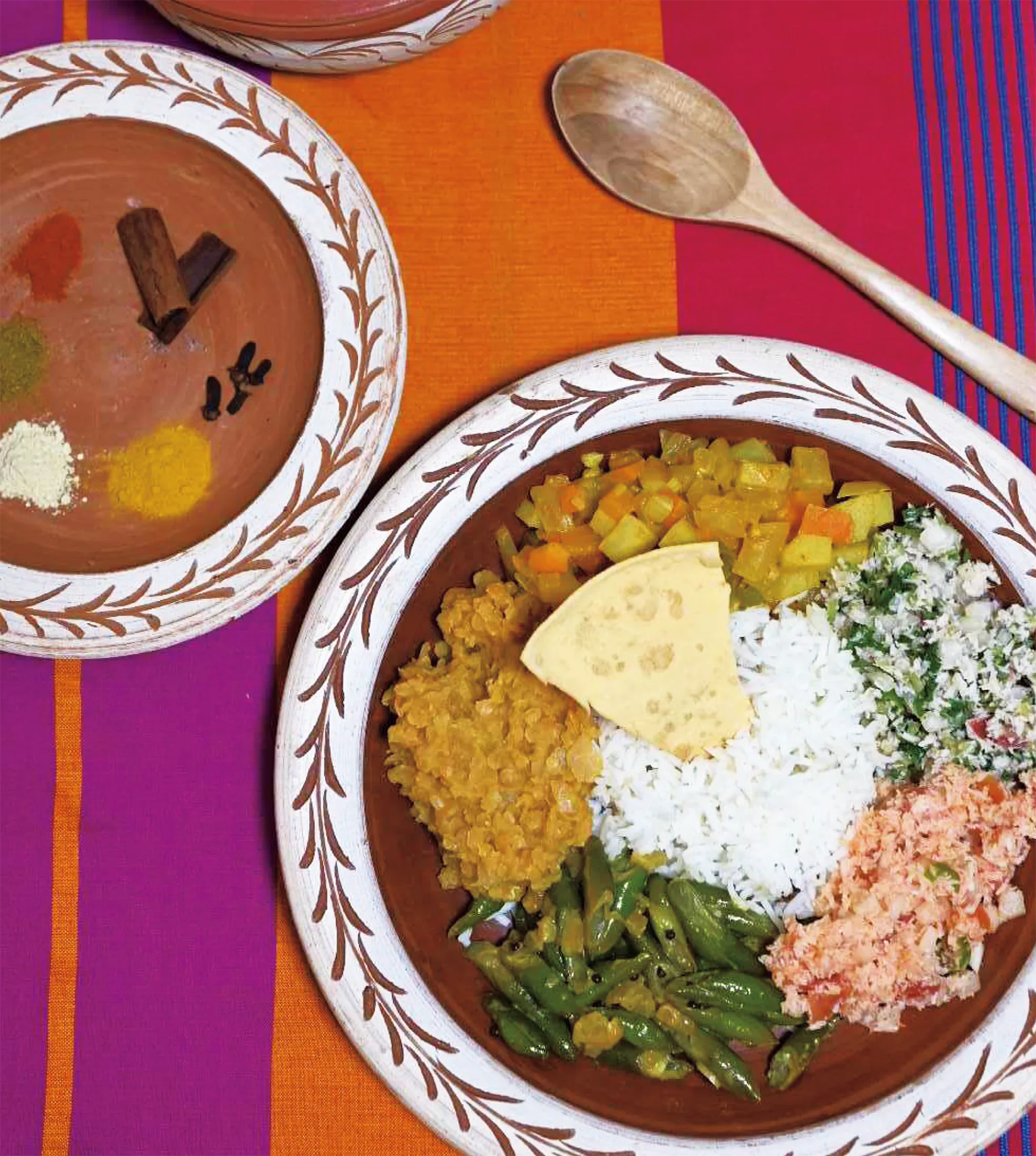 朝は豆カレーを食べることが多く、昼・夜は野菜のカレーを中心に、魚や肉を使ったカレーを食べることも。ココナッツミルクがベースのことが多く、素材の味を引き立たせるためにさまざまなスパイスが使われている。