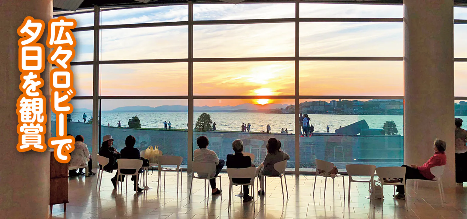 1階のロビーと2階の展望テラスから夕日を見ることができる。ロビーでは建物内から楽しめるので冬の時期はオススメ。展望テラスでは夕日に染まる松江の街も一望できる。