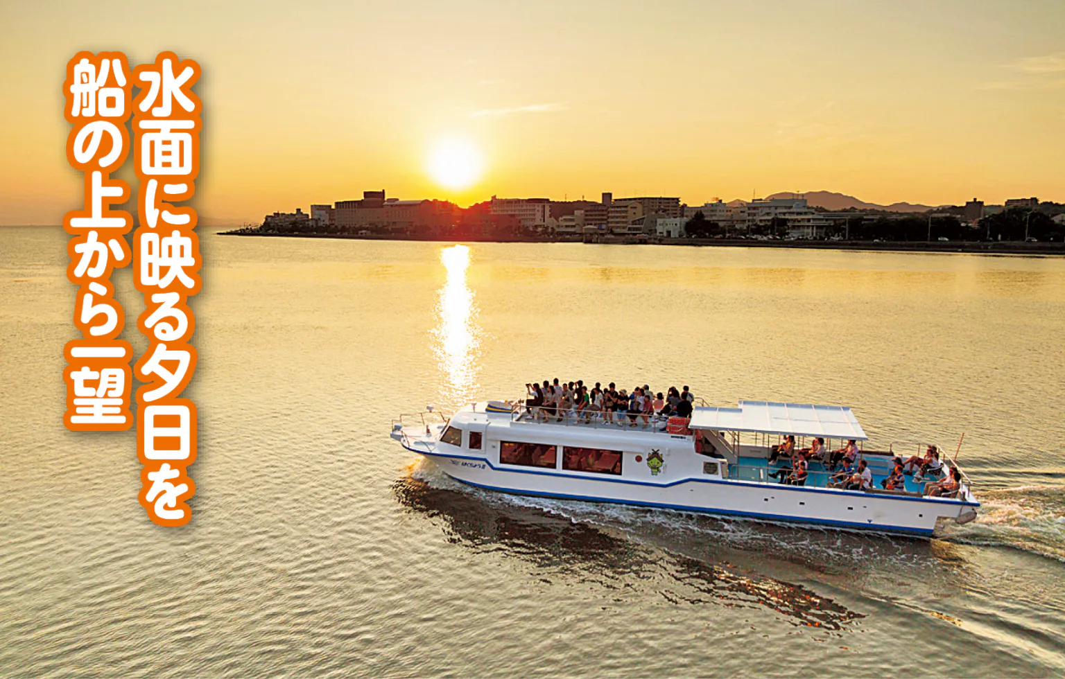 朝はしじみ漁(月・火・木・金曜)、夜は夕暮れと宍道湖を代表する2つの景色を見られるクルーズ船。サンセットクルーズは、日没に合わせてベストのタイミングで運航してくれる。運航時間は約1時間。