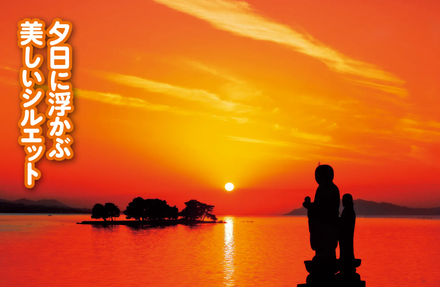 袖師地蔵と嫁ヶ島の美しいシルエットを見ることができる夕景の名所。湖岸にはテラスや遊歩道を完備しており、夕暮れどきは多くの人が訪れる。湖岸の反対側には無料の駐車場が整備されている。