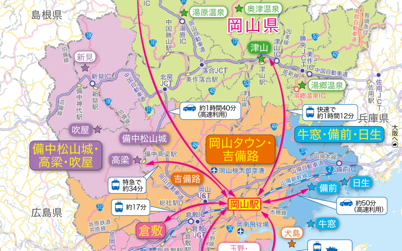 中国地方随一の面積に豊かな自然と歴史が息づく岡山。エリアのみどころや位置をしっかりチェックして出かけよう!