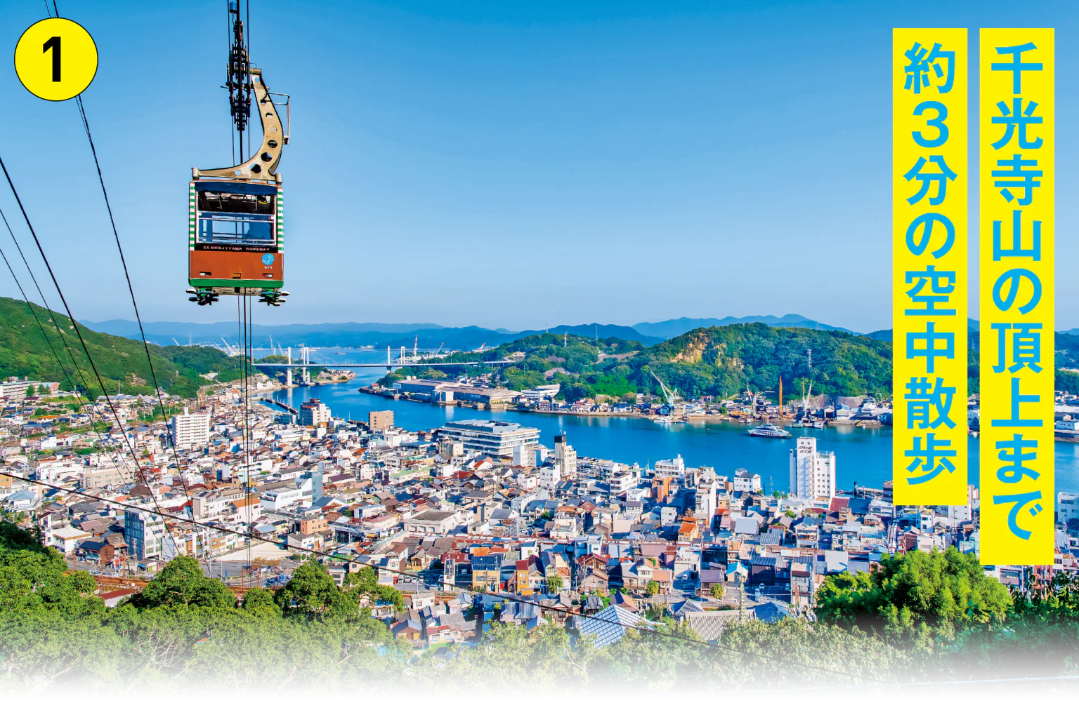 麓と山頂を結ぶロープウェイに乗って、千光寺公園へ向かおう。約3分の空中散歩の間には、同乗するガイドさんが見える景色などを解説してくれる。