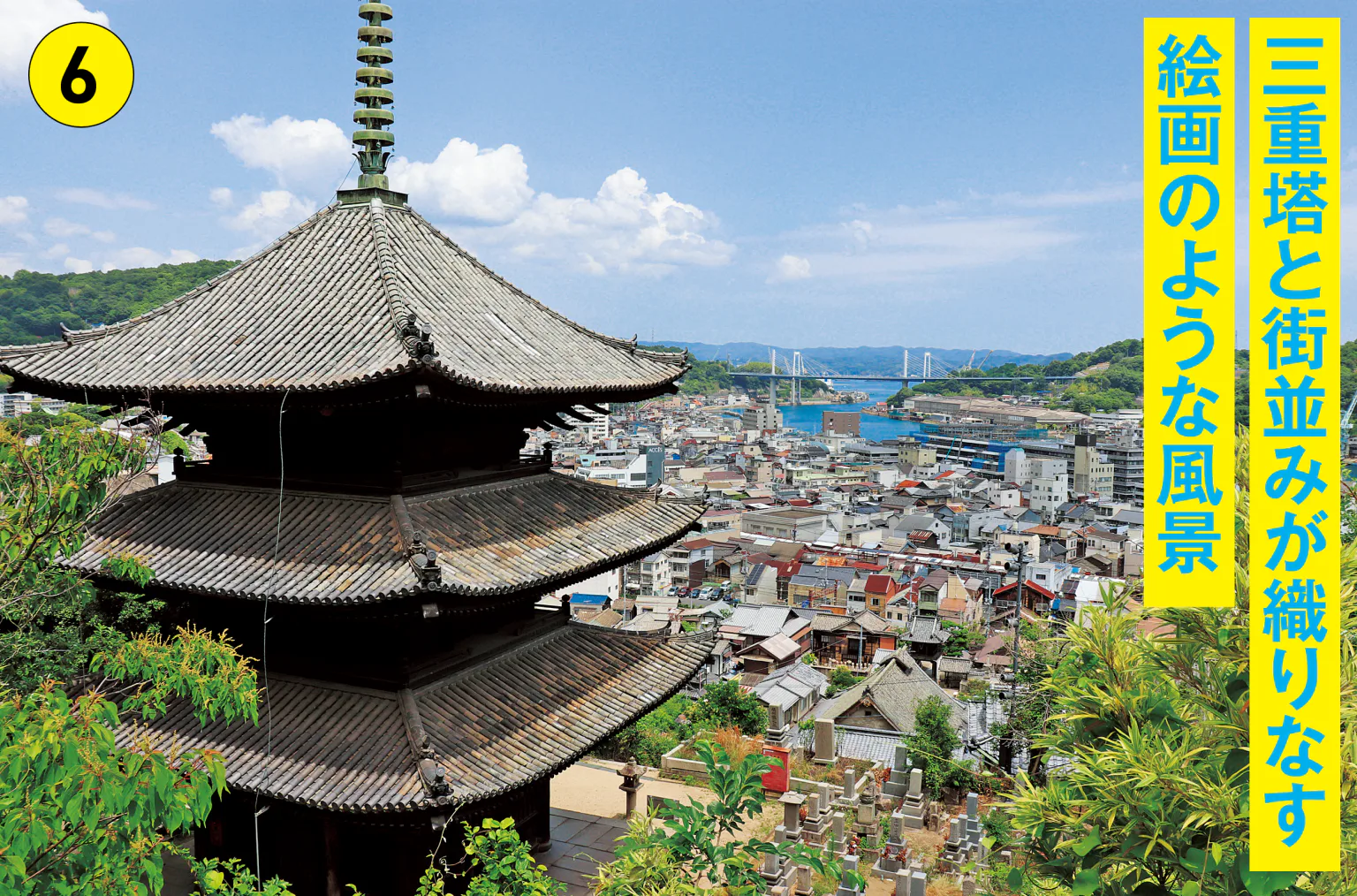 海雲塔越しに見る街並みは、尾道を代表する風景として有名。もともとは嘉慶2年(1388)に五重塔として建立されたが、三重塔として改築され現在の姿に。
