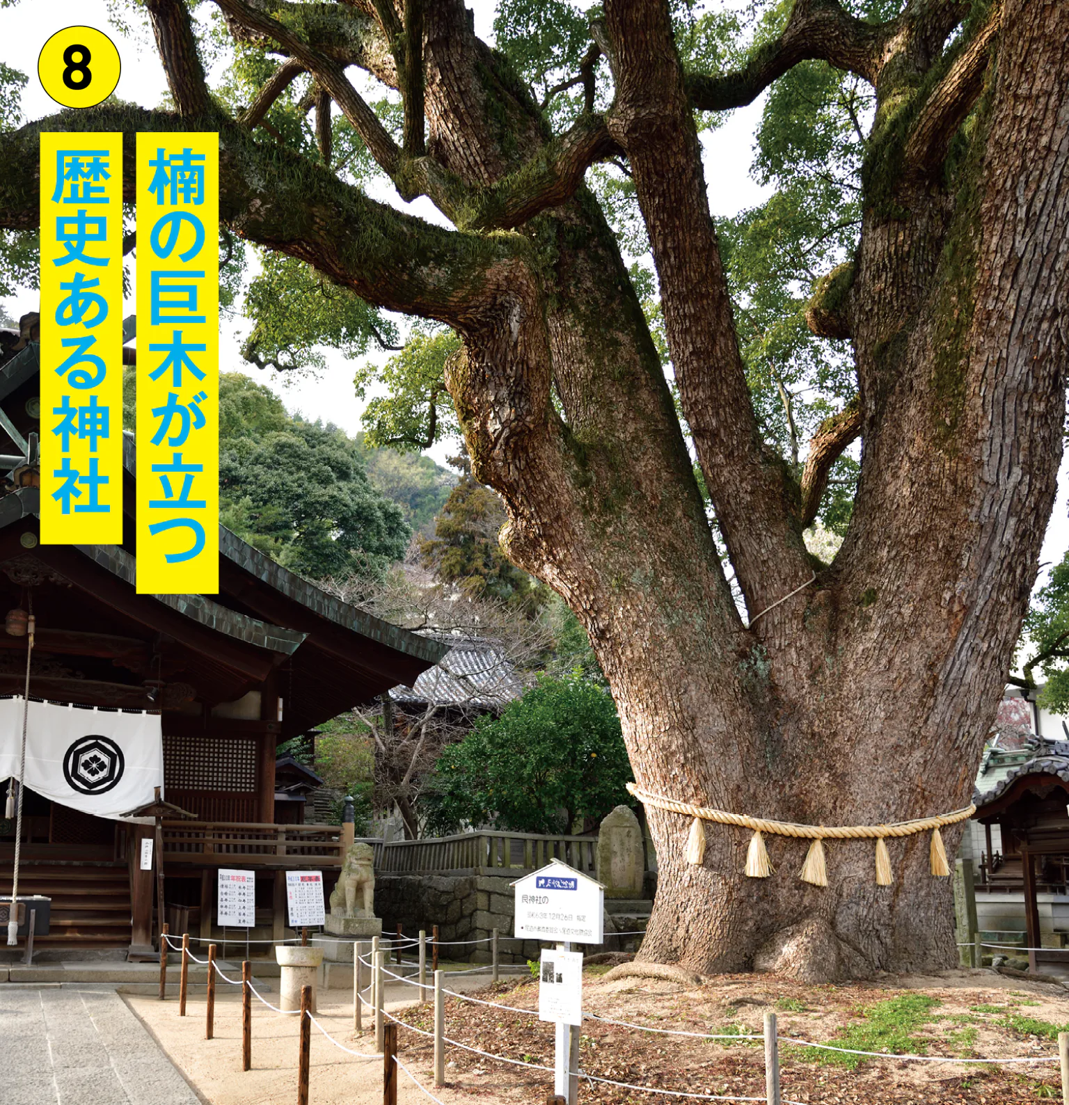 旧尾道市内最古といわれる神社。境内に立つ樹齢900年の大楠は、幹の周囲が約7mもある巨木で、広島県の天然記念物に指定されている。