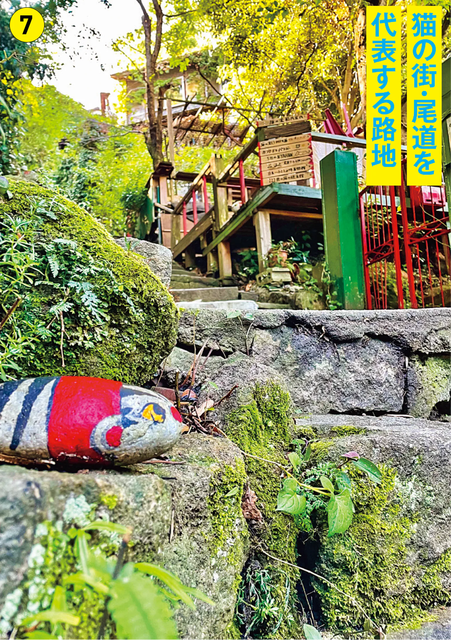 坂道や港町など多くの顔をもつ尾道のもう一つの顔が“猫”の街。艮(うしとら)神社の東側から天寧寺海雲塔にかけて続く約200mの細い路地には多くの猫が暮らしている。