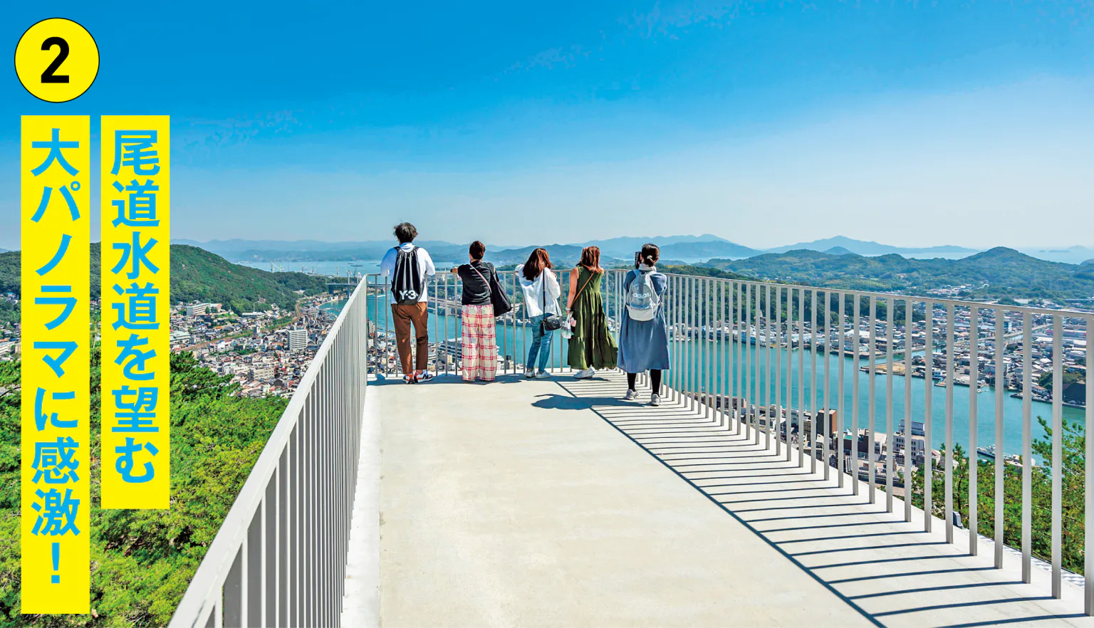 千光寺山の頂上から中腹にかけて広がる公園にある展望台で、県内に4カ所ある“恋人の聖地”の一つ。標高約144mの高さから、向島をはじめとしたしまなみ海道の島々まで見渡せる。