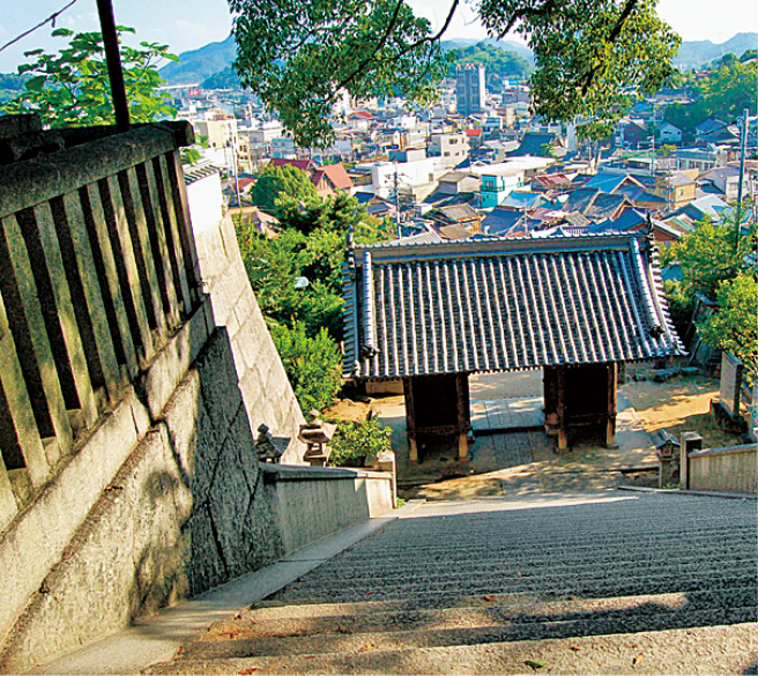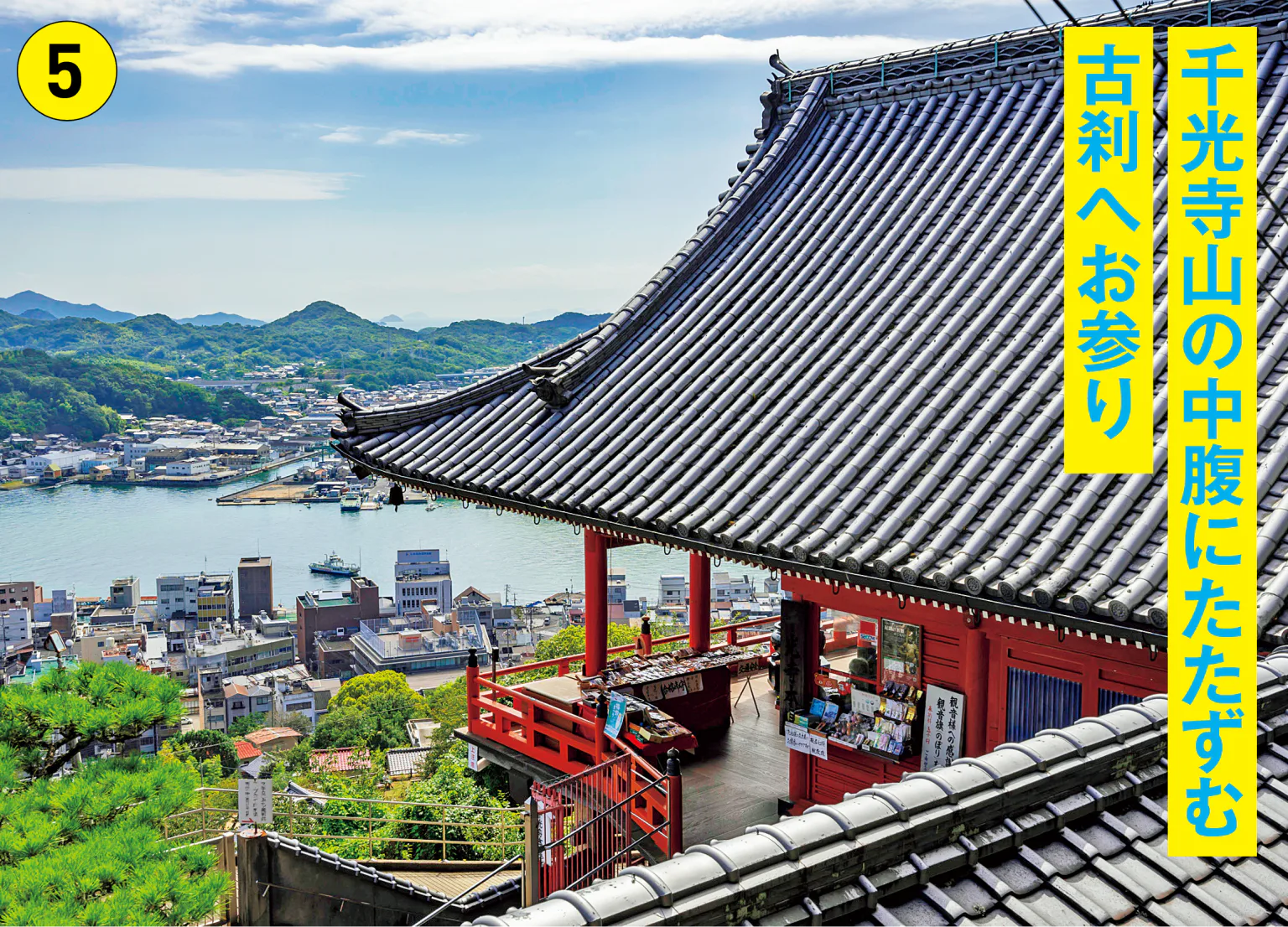 大同元年(806)創建と伝わる尾道屈指の歴史を誇る古刹。朱塗りの美しい本堂は山の斜面からせり出すような舞台造で、ここから眺める景色は圧巻だ。