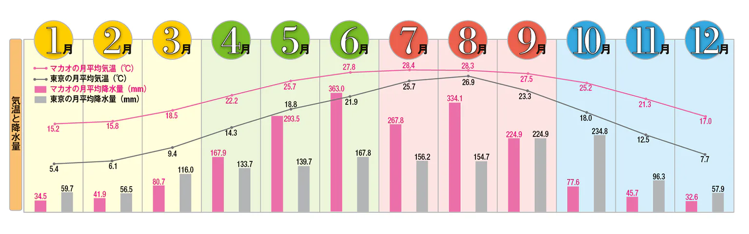 晴天が続き、湿度も低い10~12月がベストシーズン。1~3月も晴天は多いが、やや寒い。5~9月は暑く、雨も多い。夏は台風が多く、その強さによっては外出を控える必要がある。年間の平均気温20°C以上だが、冬には防寒具が必要となる。旧正月の期間はほとんどのお店が閉まるので要注意。