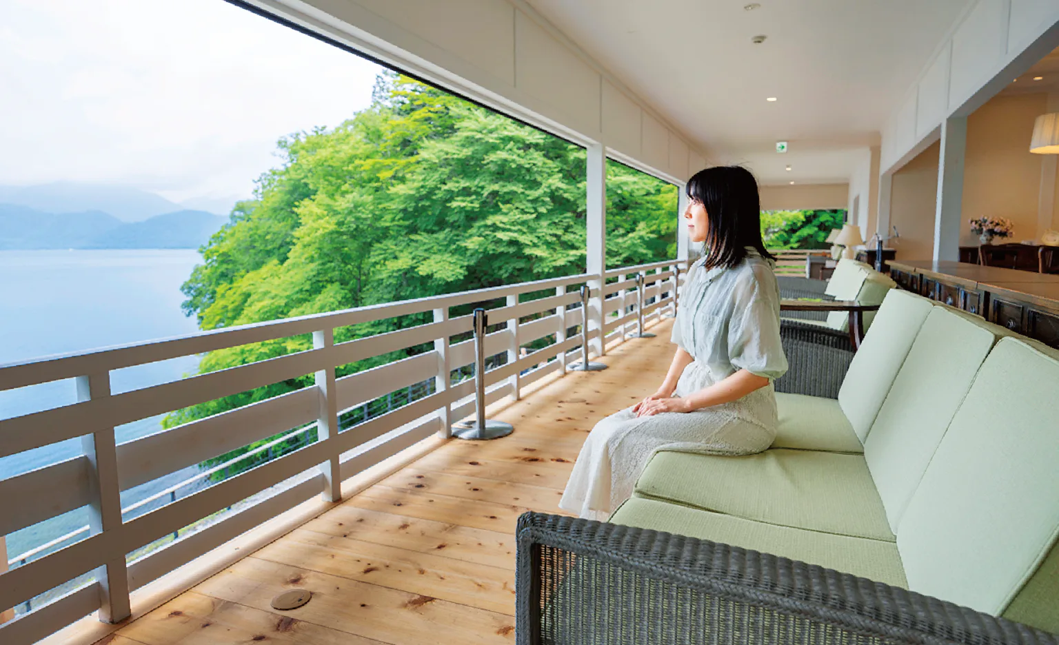 椅子にも一つひとつ工夫が。湖畔を望む椅子は背をゆったり預けられて、くつろげるようになっている