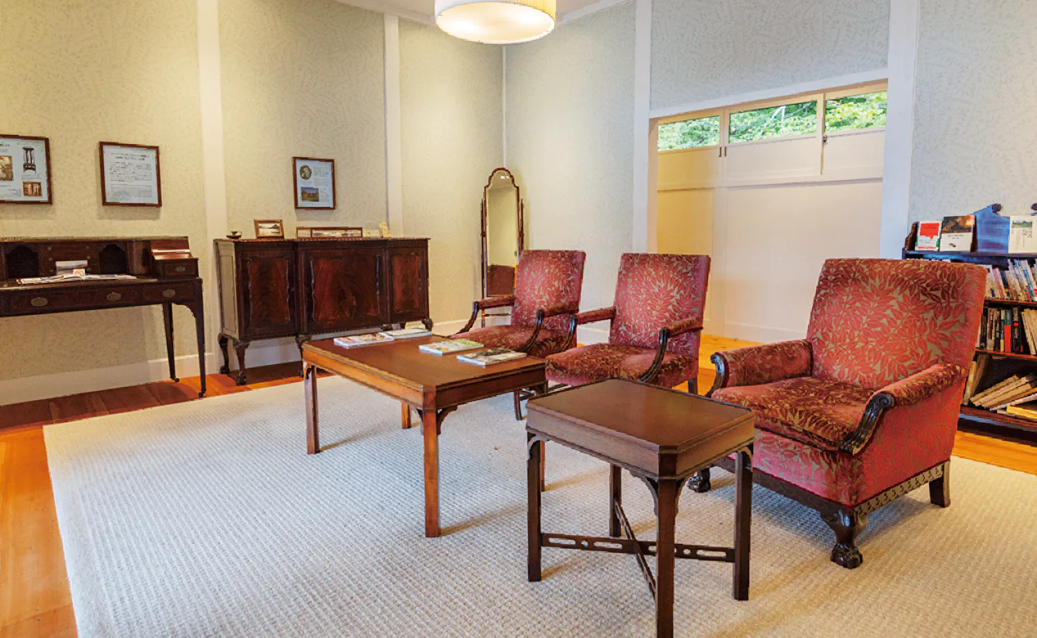 イタリア大使やその家族が避暑に訪れた別荘。昭和3年(1928)に建てられ、平成9年(1997)まで使われていた建物を復元。家具や食器は実際に使われていたもので、当時の暮らしぶりを垣間見ることができる。