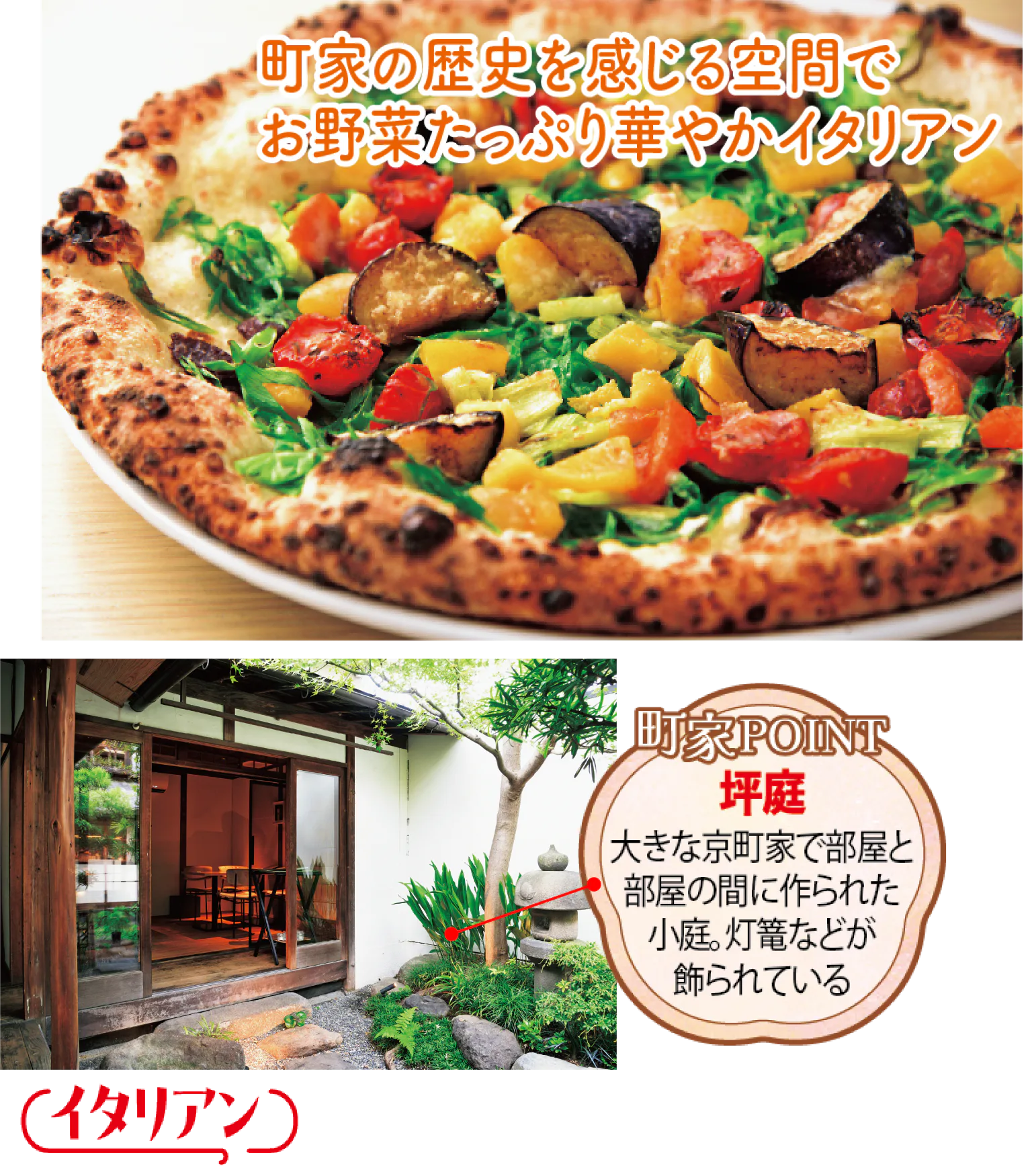 2024年9月にオープンしたトラットリア。もとは染物屋だったという約150年前の京町家を改装した空間で、京野菜や丹後の魚介を使った京都テイストあふれる、本格ピッツァやイタリアンを味わえる。盆栽をデザインしたロゴマークのある白いのれんが目印。