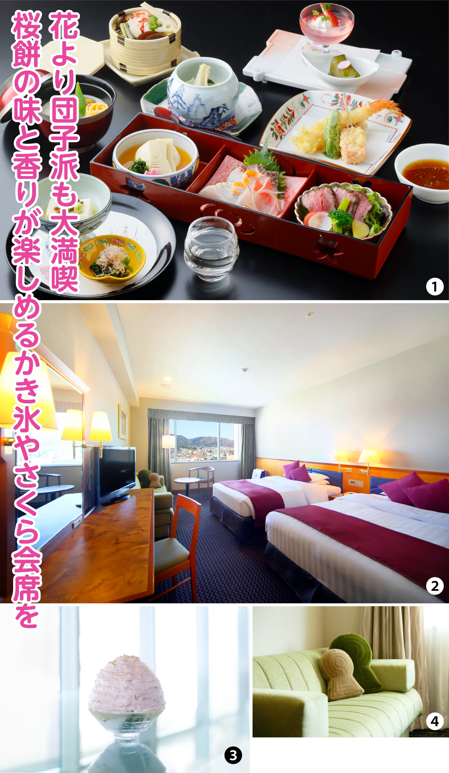 ①春の彩りを楽しむこの時期人気の花見弁当は3800円/②バス・トイレ別で広々とした室内でくつろげるラージツインルーム/③2月1日~3月31日の期間限定提供の桜餅氷は1600円/④ラージツインルームには古墳の形のかわいいクッションが!