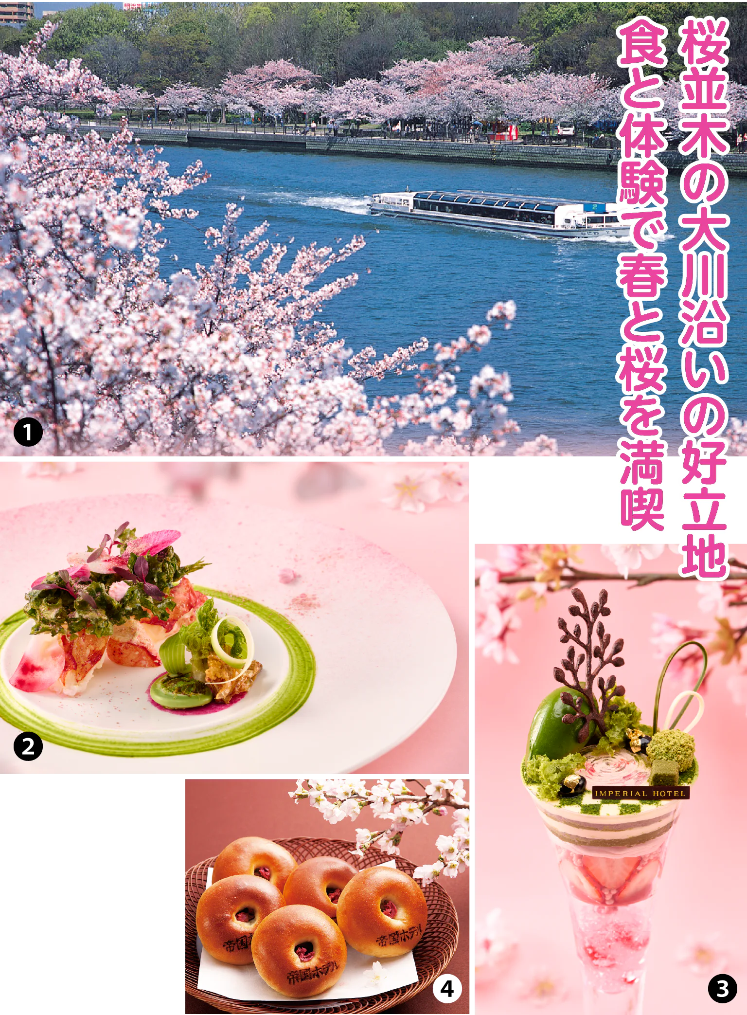 ①「大阪満喫桜クルーズステイ」は1泊朝食付で2名5万4900円~/②フランス料理「レ セゾン」では桜鯛や仔牛、春野菜を使用したコースを提供/③カジュアルレストラン「カフェ クベール」の「華やぎ香る日本庭園 桜の調べ」は3600円/④帝国ホテルの焼印入りの「桜あんぱん」は1個300円