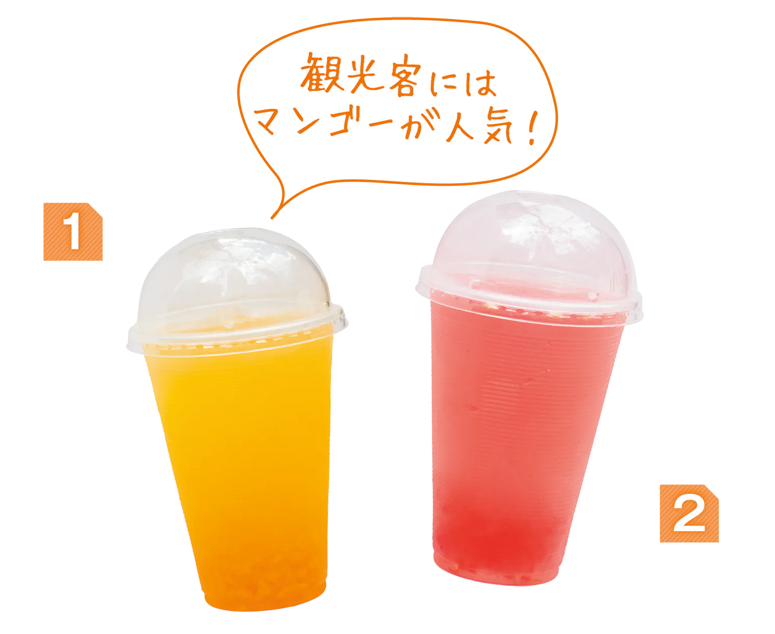 果汁入りの冷たいフルーツジュースでクールダウン。マンゴーやスイカのほかココナッツやキュウリジュースも。