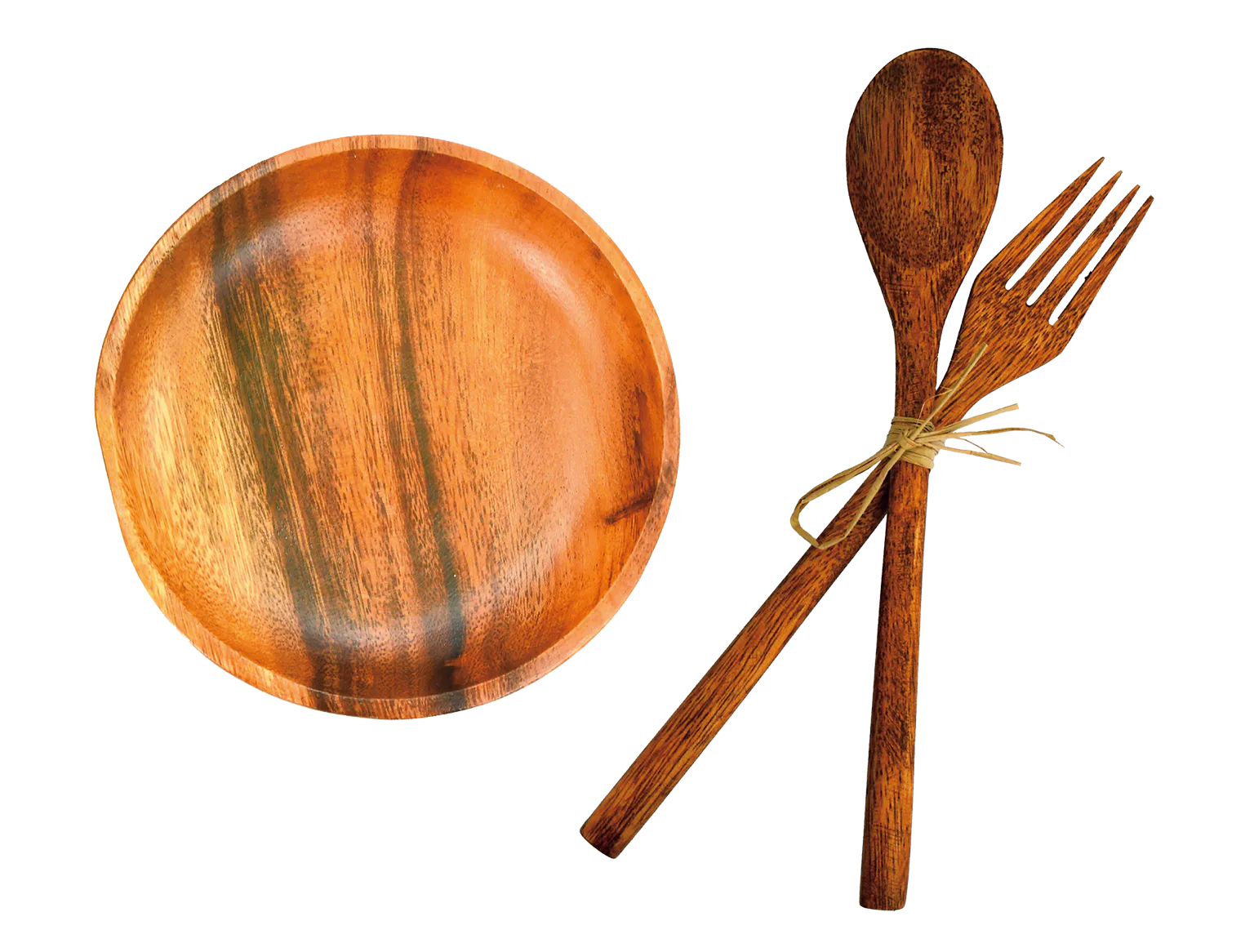 ハンドメイドの木皿やカトラリーは、木目など好みの模様をチョイスして