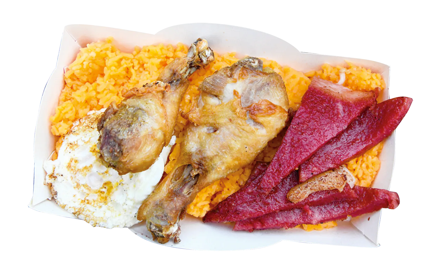 香りのよいターメリックライスの上に、グリルした鶏肉とハム、目玉焼きが乗ったボリューム満点のプレート