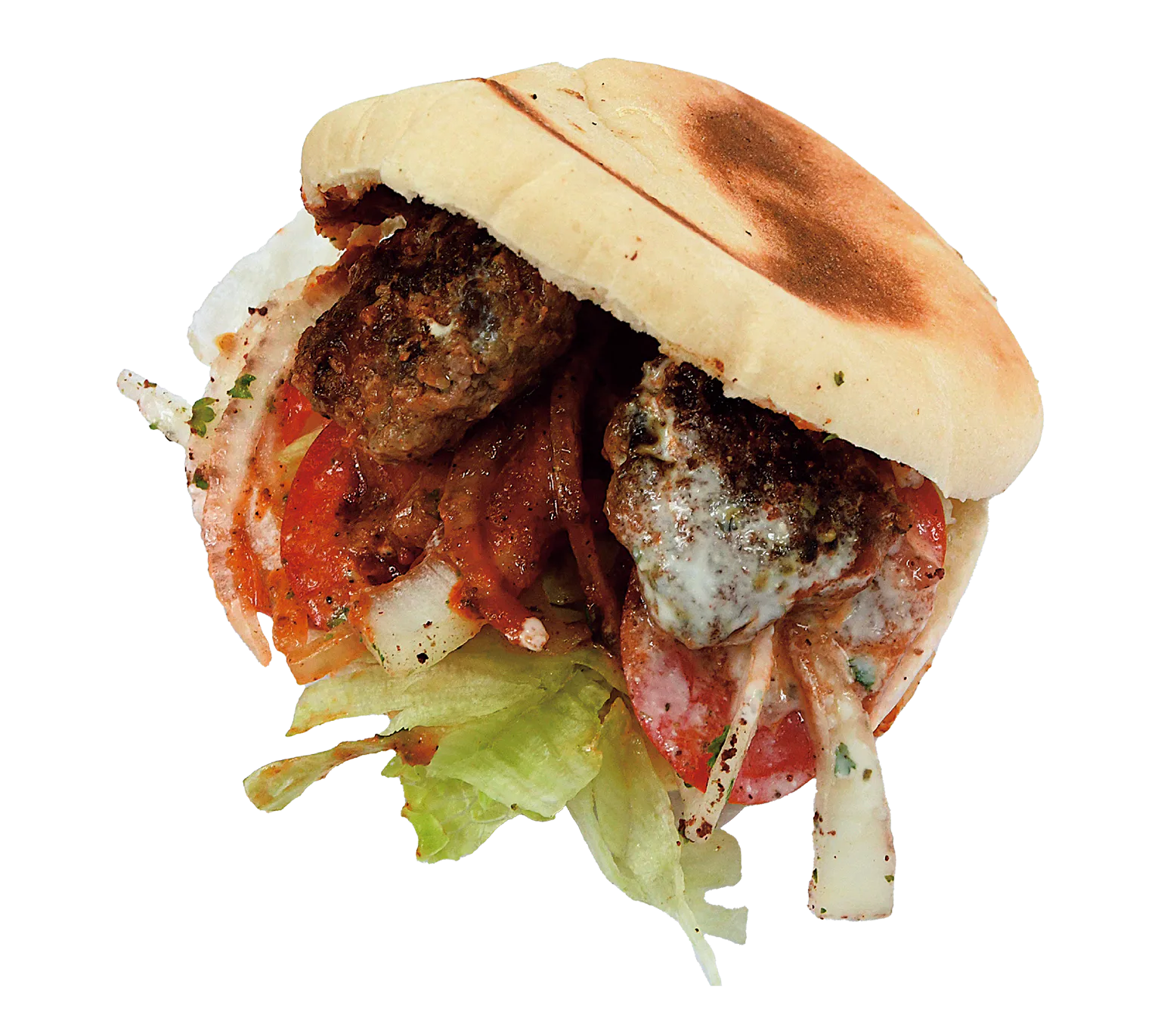 キョフテはトルコ発のスパイスが香るミートボール。トマトやタマネギなどの野菜と一緒にピタパンに挟んで食べる。レギュラーサイズは250P