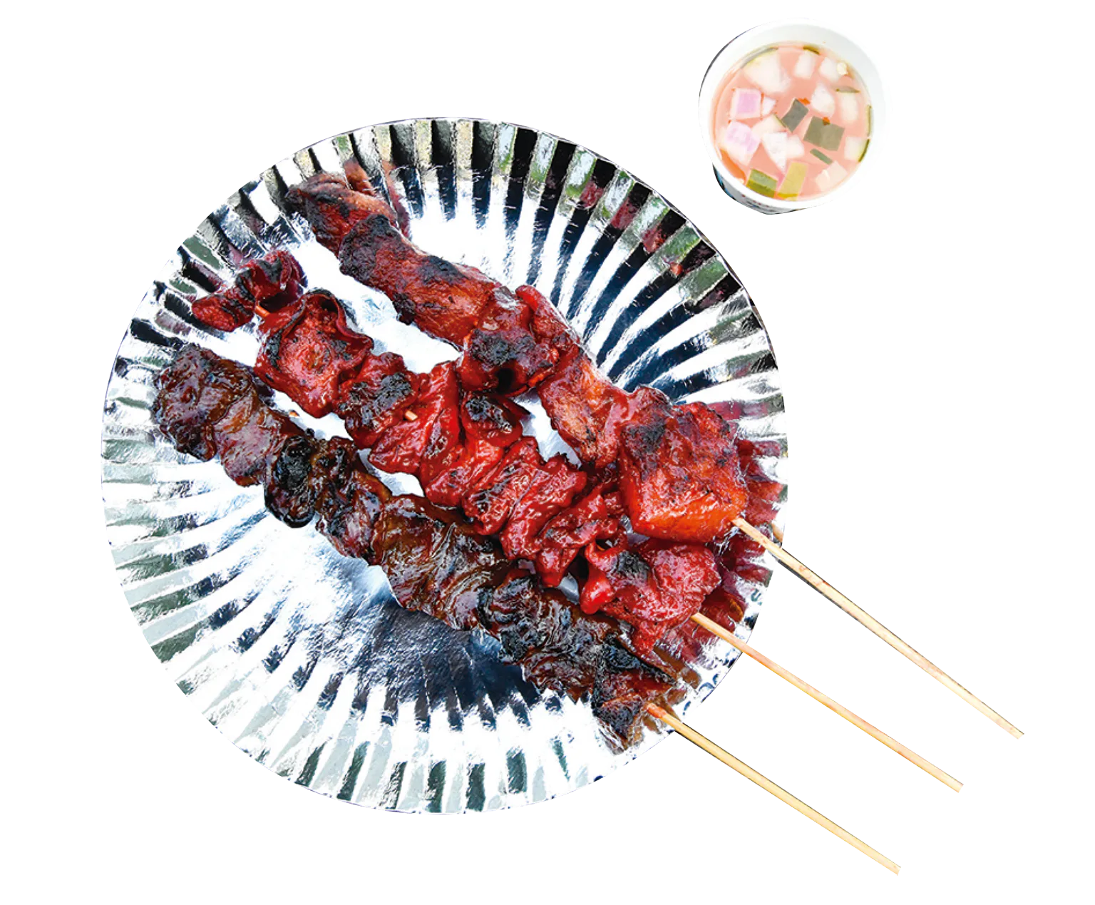 豚のあらゆる部位を串刺しにしたバーベキュー。オーダーしてから炭火で焼き直してくれる。ビネガーと一緒に。3本買うと100P