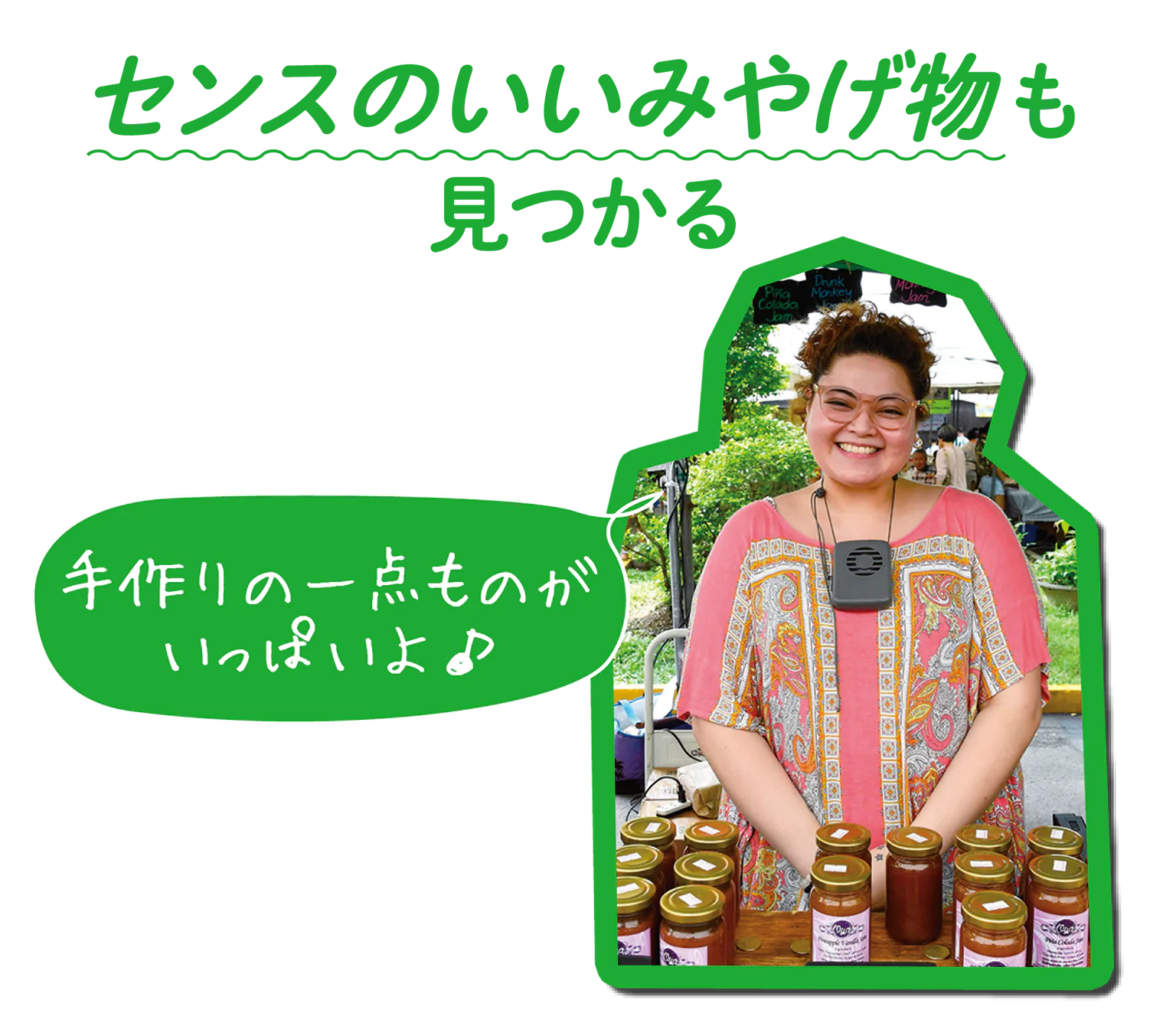 犬の散歩途中に訪れる人もいて、平和な雰囲気が漂う日曜市。デリや各種フードコーナーはもちろん、食器やアクセサリー、コスメ、バッグなどもあって、雑貨好きにはたまらない品揃え。人気の店のデリは売り切れることもあるので、早めの時間がおすすめ。