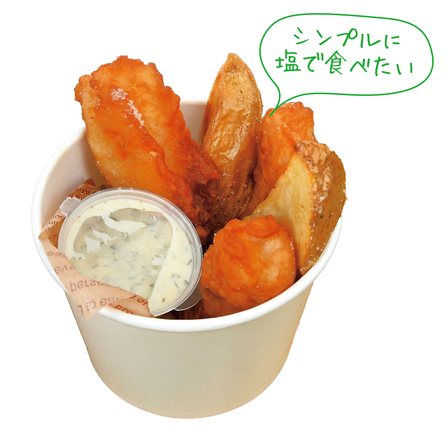地元で獲れたスズキなどの白身魚を揚げた、ホクホクのフィッシュフライが絶品。甘味のあるフライドポテトもおいしく、早い時間に売り切れる。タルタルソース付き。