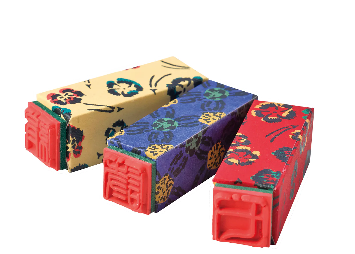 100年以上前のデザインを再現した伊勢千代紙で包んだはんこ。約500種