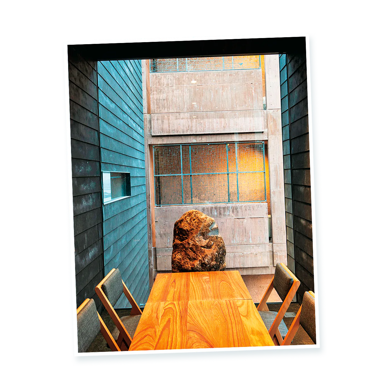 新進気鋭の日本人アーティストの作品を展示する新しいコンセプトの温泉宿。使い込まれたような質感のコンクリートを使ったモダン建築に、現代アート作品が映え、窓の外に広がる別府の景色に包まれながら非日常の時間が過ごせる。レストランTHE PEAKのみ利用し、日帰り利用できるのもうれしい。