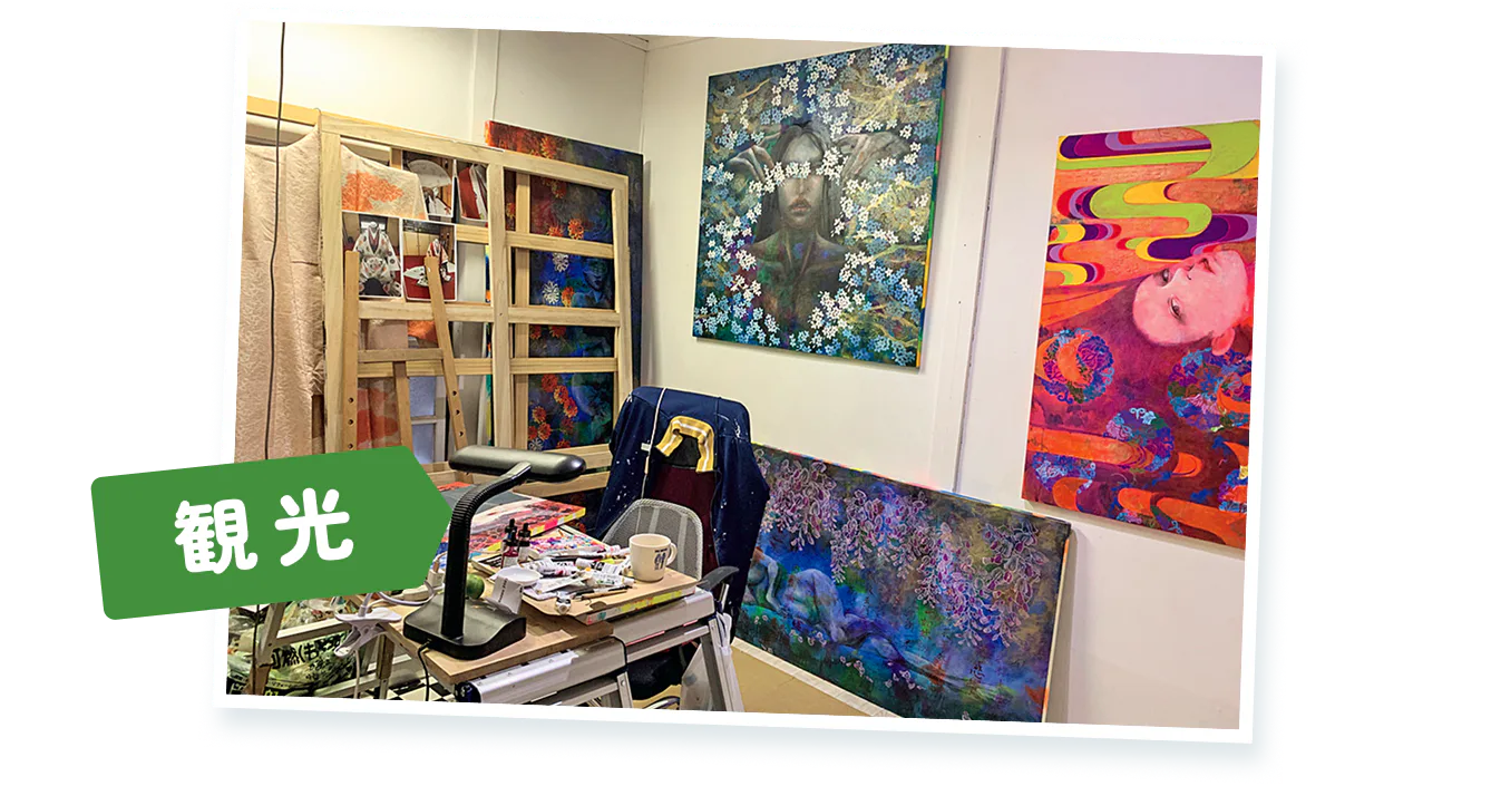 アトリエで最新の作品や創作の現場を間近で見学可能。
