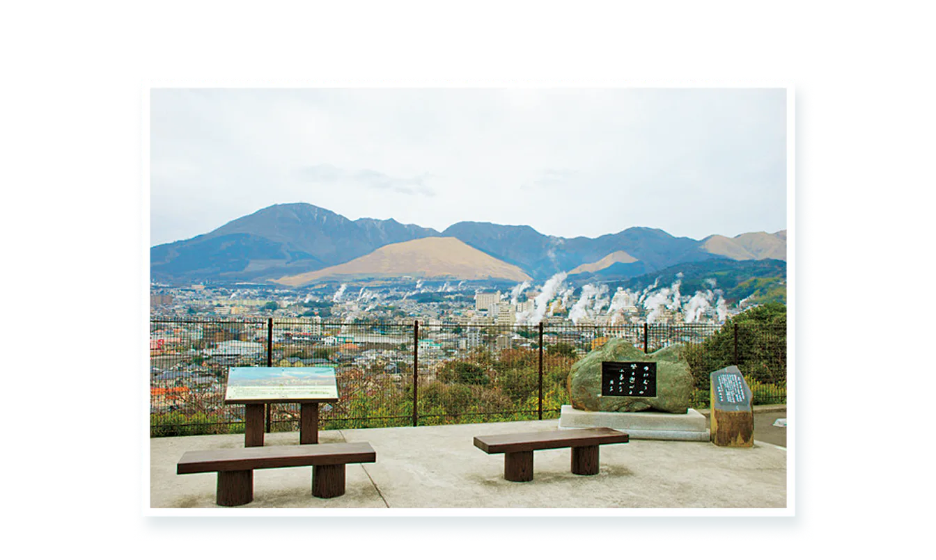 鉄輪温泉街を一望できる展望台。立ち昇る湯けむりと扇山や鶴見岳が広がる光景が、癒やしを与えてくれる。展望台から眺める夜景は「日本夜景遺産」に認定されており毎週土・日曜、祝日19〜21時には「湯けむりライトアップ」が実施される。