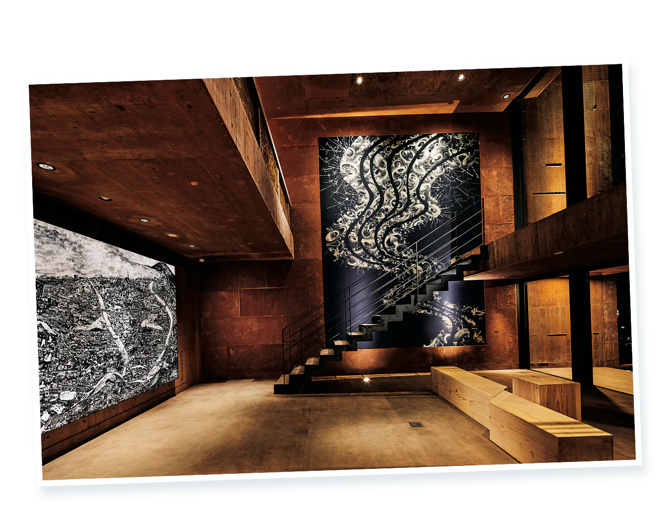 錆びたような色彩のロビーには、鈴木ヒラク『ゆらぎから光へ』(右)と西野壮平『別府温泉世界地図』(左)が展示されている