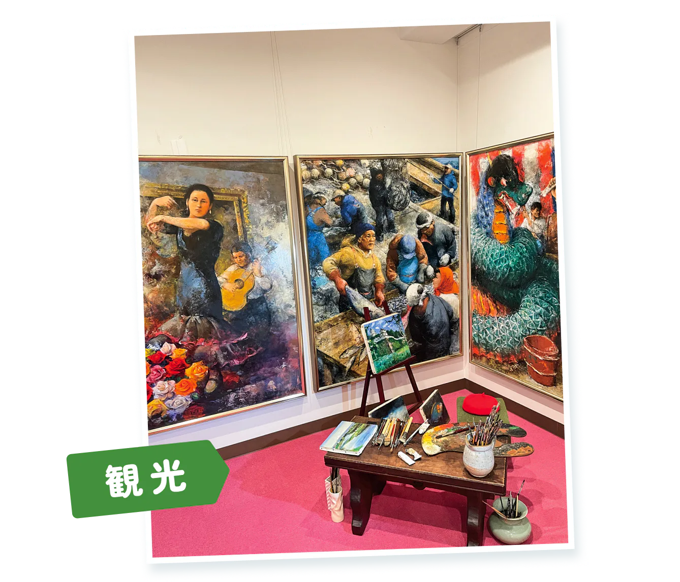 サルバドール・ダリやパブロ・ピカソほかの名画をはじめ、国内外の有名芸能人の作品が展示されている。創作中の絵画を前に画家のポーズで撮影できるコーナーも人気だ。