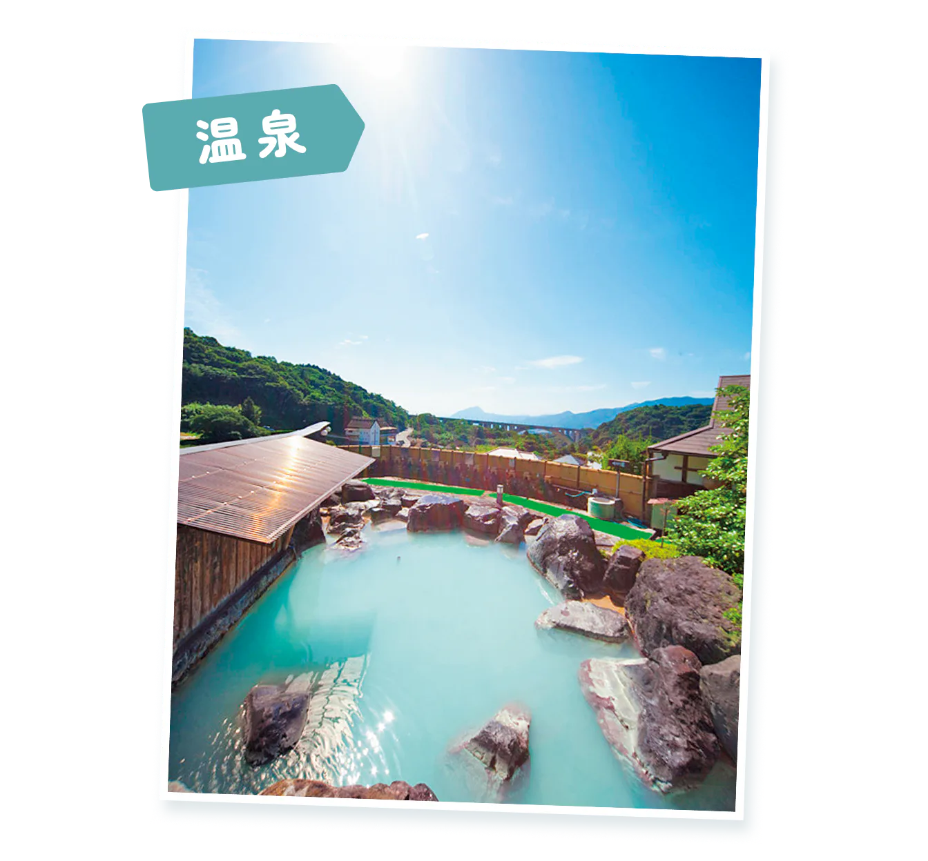 別府一の高台に位置する大露天岩風呂からは、別府明礬橋や鶴見岳、高崎山などの景色を眺められる。乳白色の硫黄泉は、美肌効果が期待できる。天然素材の入浴剤やコスメ商品にも注目。