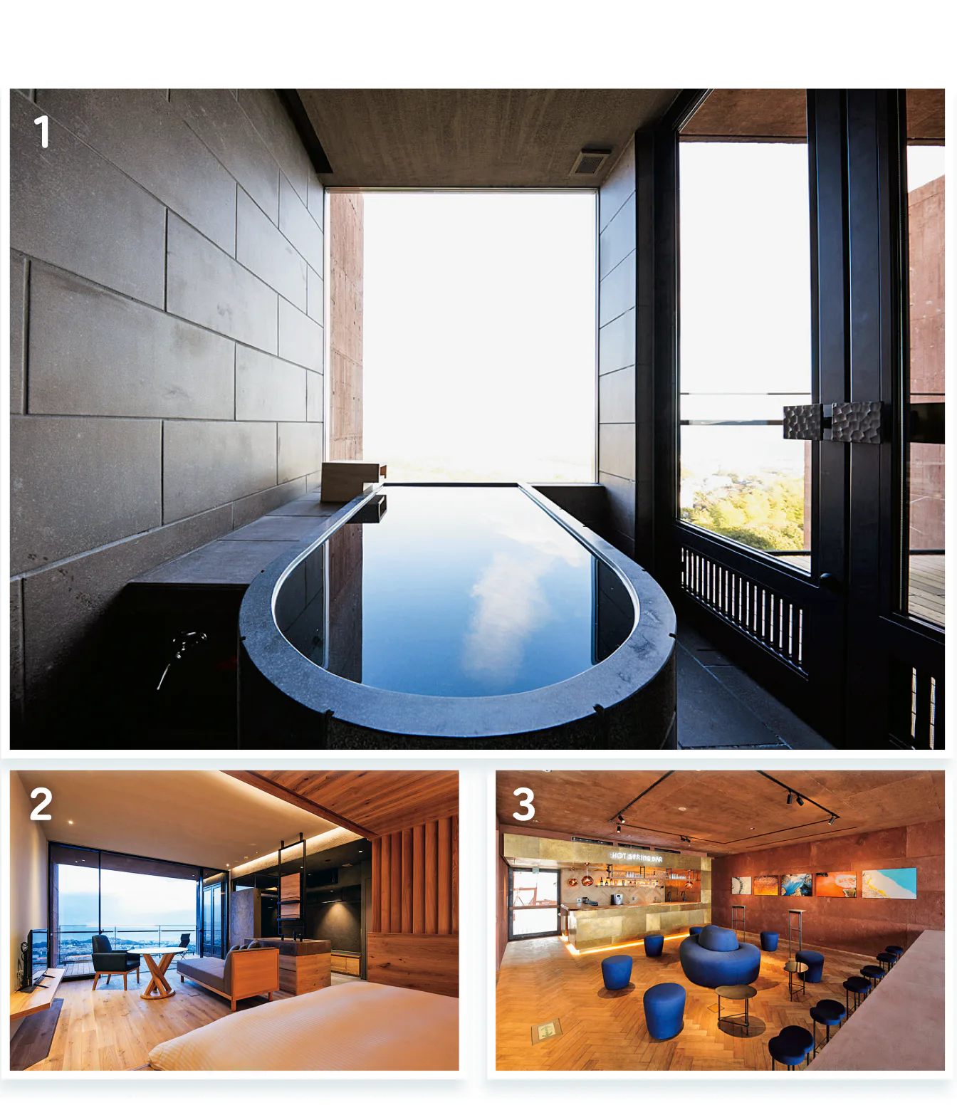 1.全室半露天風呂付きで別府八湯のひとつ、堀田温泉の名湯を景色とともに楽しめる /2.景色とアート作品が異空間の雰囲気を醸し出すキングルーム/3.壁面を彩る5点のアートが特徴のHOT SPRING BAR