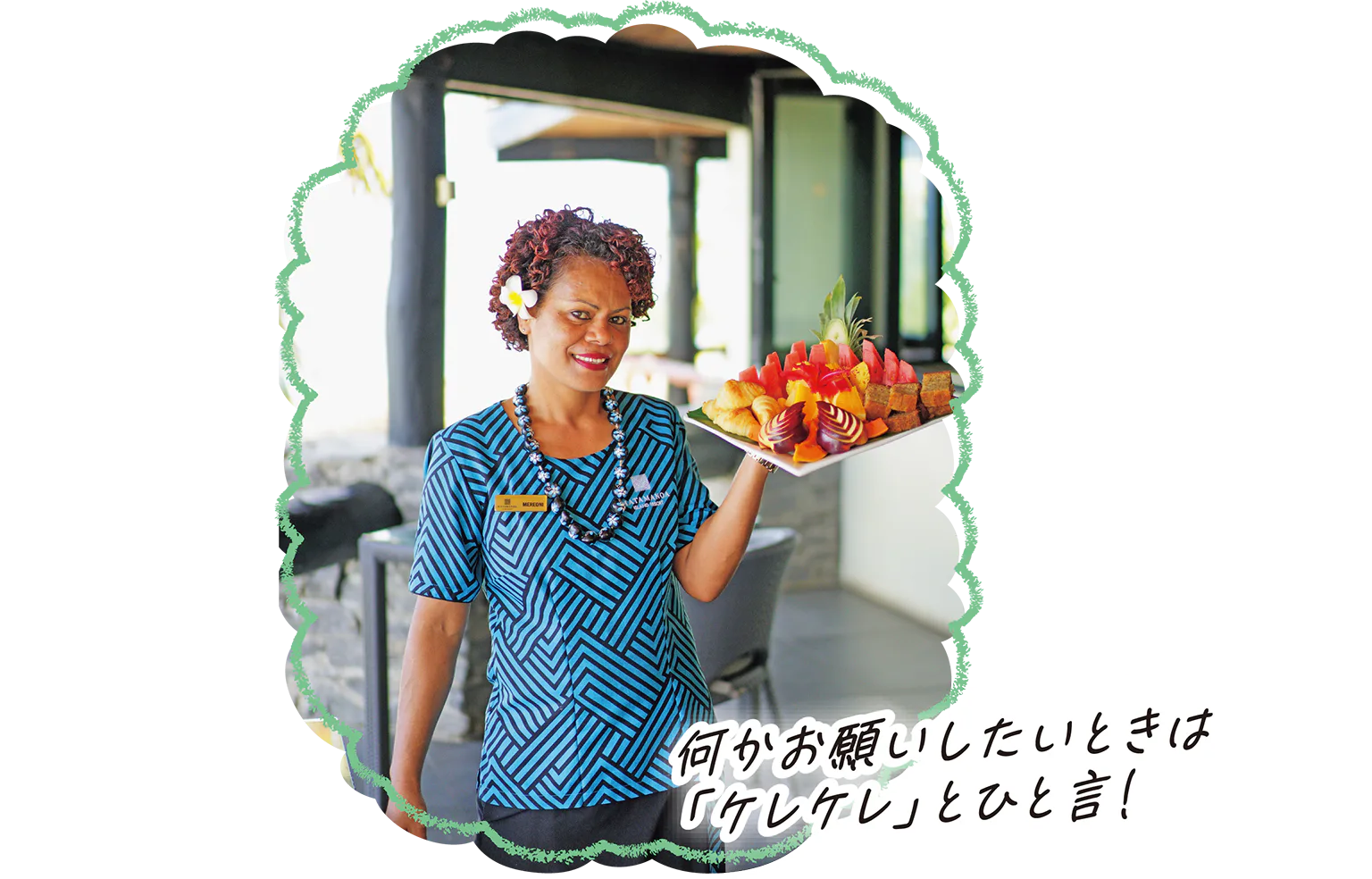 上記のような「ケレケレ文化」が根付くフィジアンにとって共助は朝飯前。助け合いの精神は人一倍で、困っていたら手を差し伸べる、子供の遊び相手になるなど、ホスピタリティの高さは他国の比ではない。ゲストとも密にかかわってくれるので、困ったときは「ケレケレ」とスタッフに伝えれば、ビッグスマイルで対応してくれる。