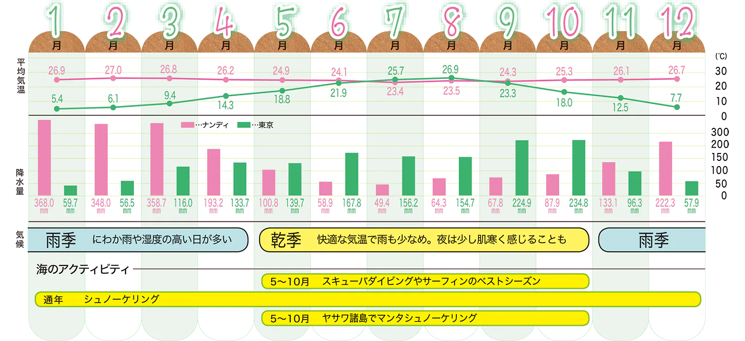 フィジーの気候は雨季と乾季に分かれるものの、ビチレブ島などの大きな島では、高い山脈と南東の貿易風によって降水量と湿度にばらつきがある。南東部のスバは一年を通じて雨が多い一方で、西部のナンディ周辺は比較的晴れが多いのが特徴。