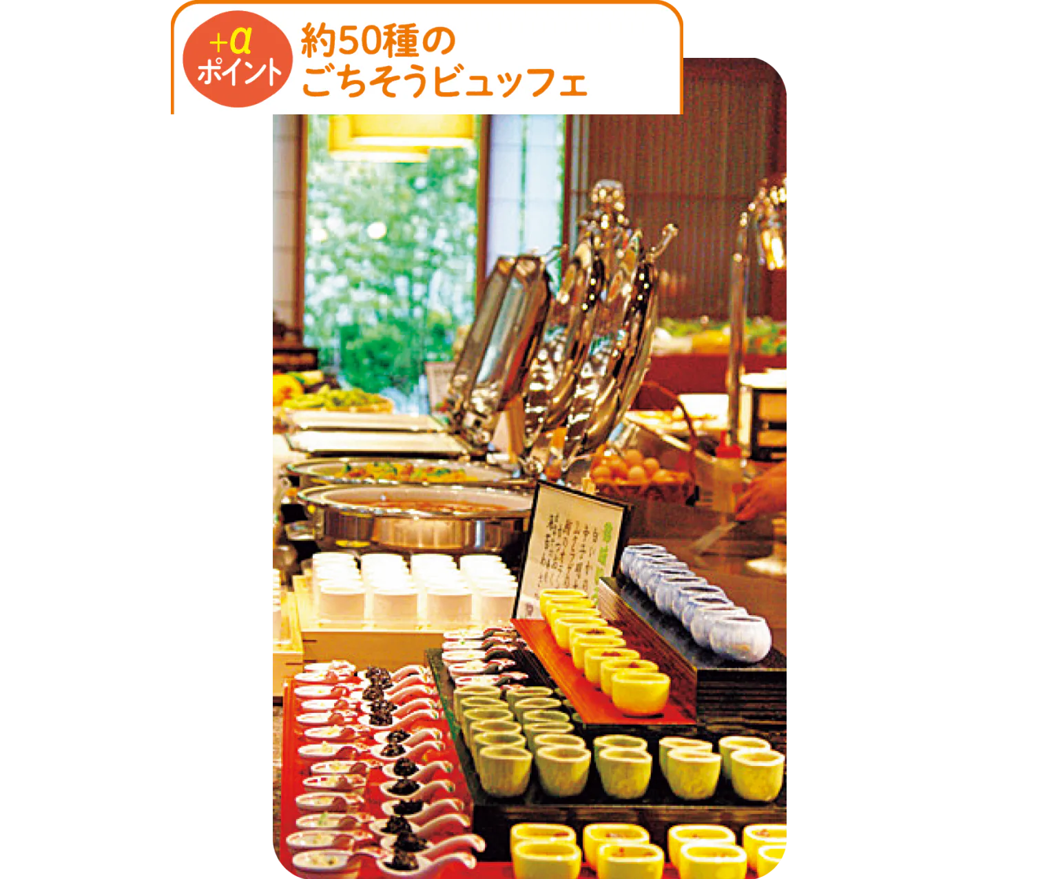 お風呂は大浴場のほか貸切露天風呂なども充実。山陰地方の旬の食材を使用したバイキングを楽しめるのも魅力。