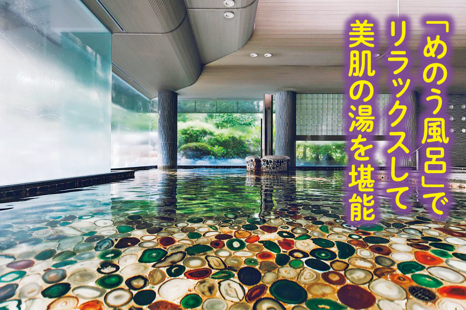 全国的にも珍しいパワーストーンの「めのう」を敷き詰めた大浴場が自慢の宿。朝夕で男女入替制のため、趣の異なる浴槽を楽しめる。料理も地産食材を使用した創意工夫の品々を提供する。