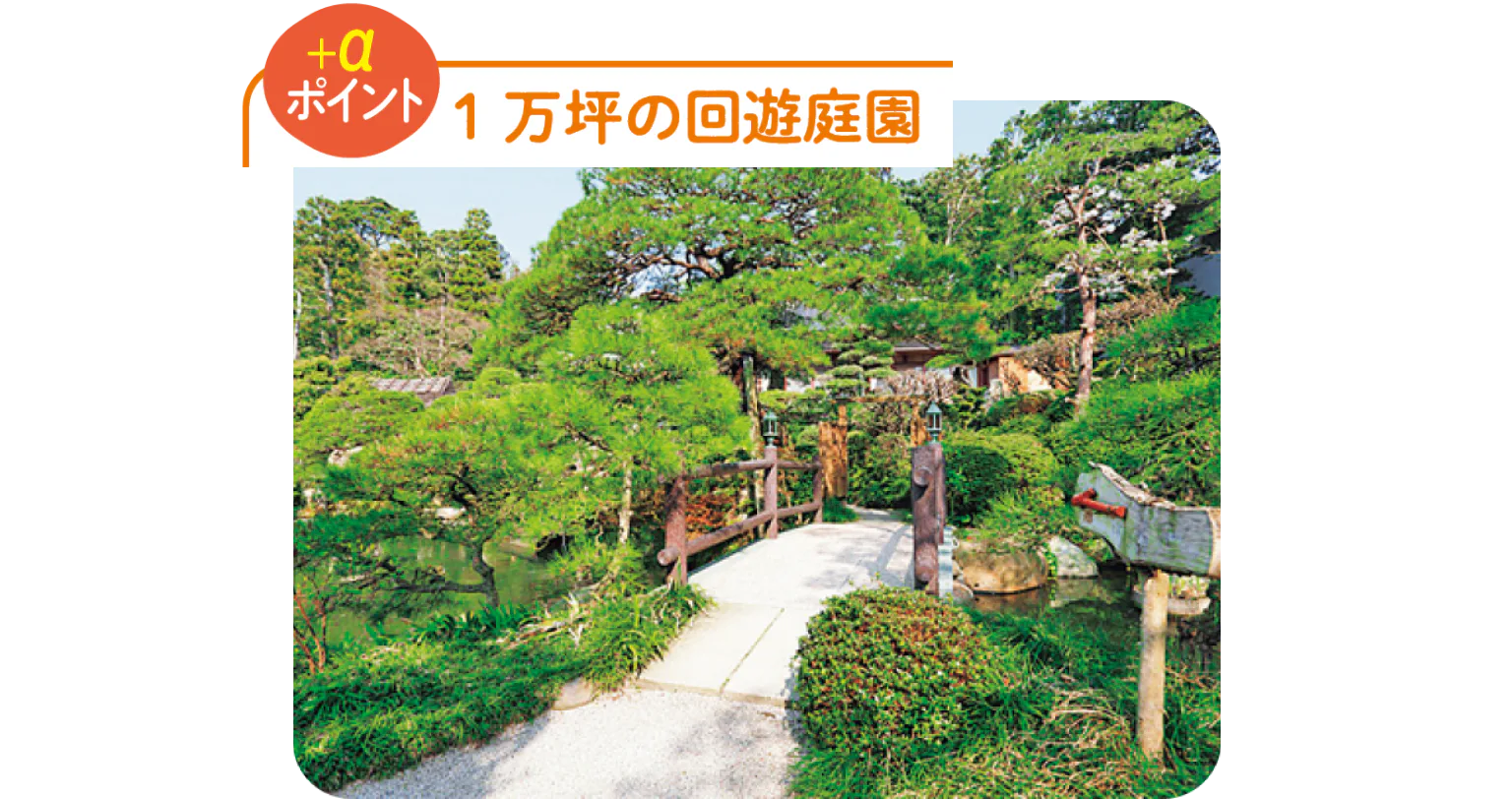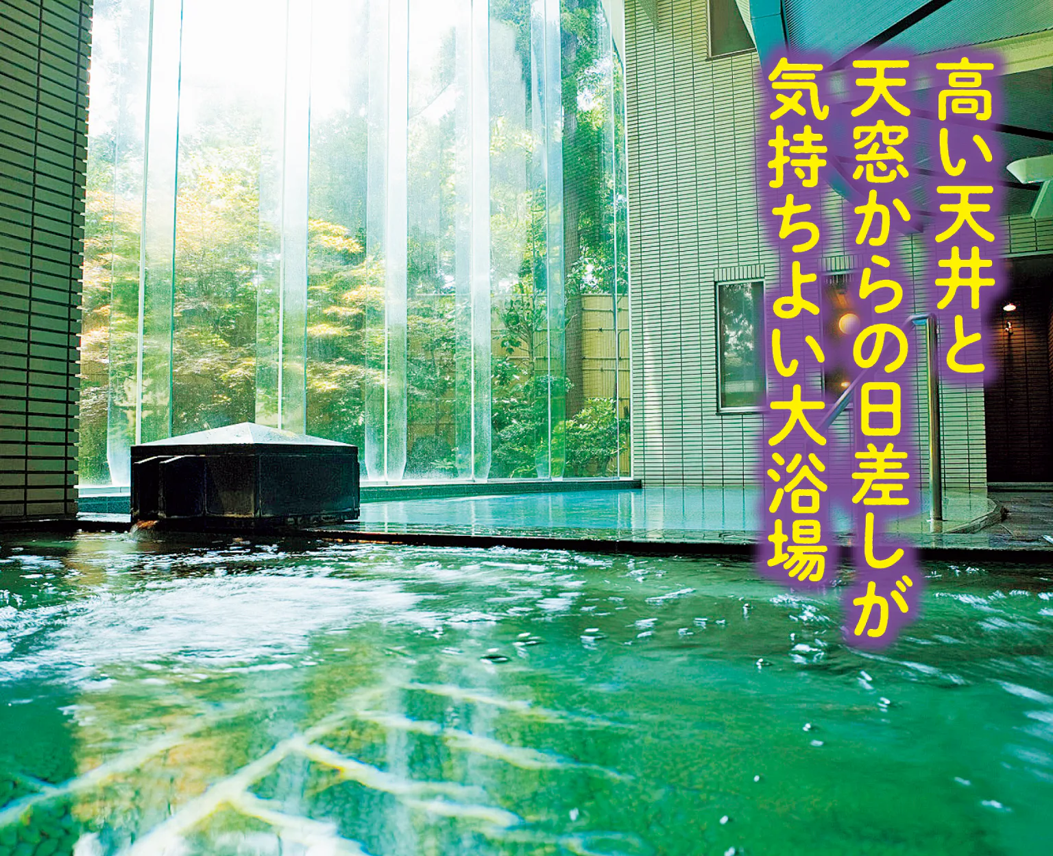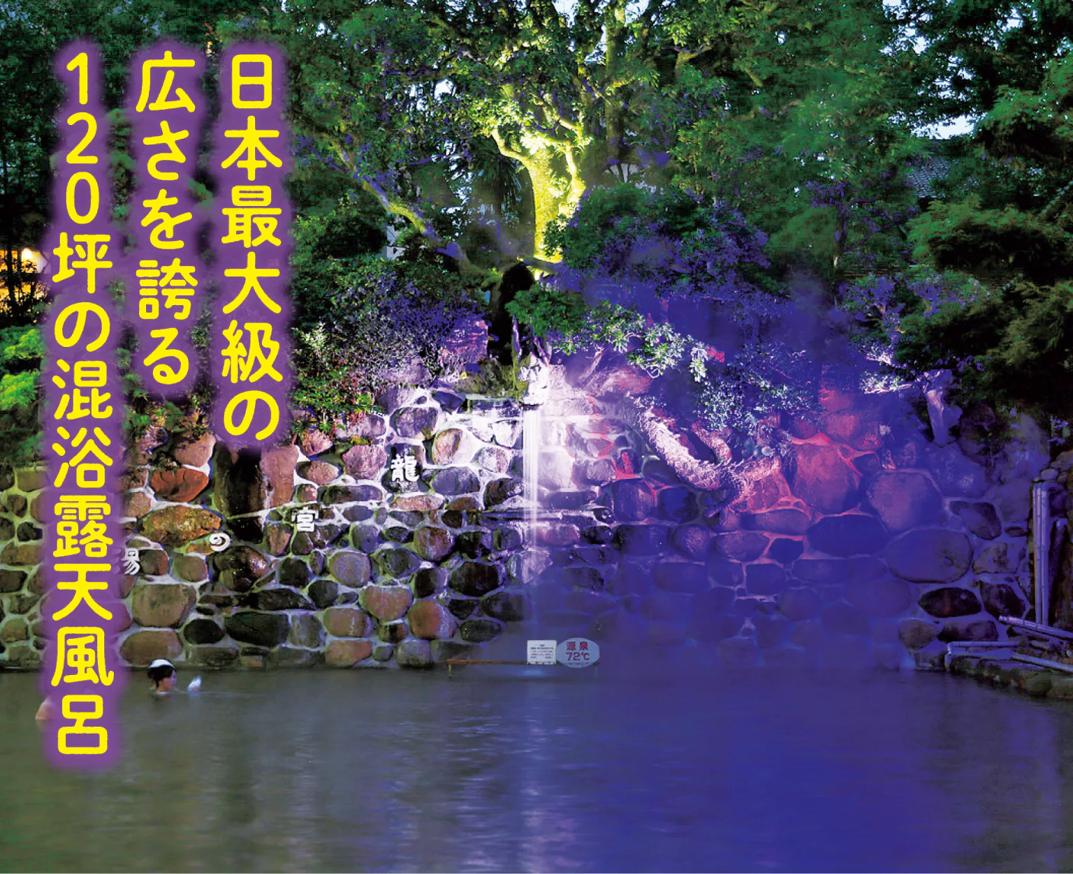 源泉かけ流しの混浴露天風呂「龍宮の湯」の広さは120坪。男女ともに入浴着の無料貸し出しがあり、女性には専用の内風呂もある。客室は本館のほかに露天風呂付き特別室「寿之間」「常盤之間」もある。