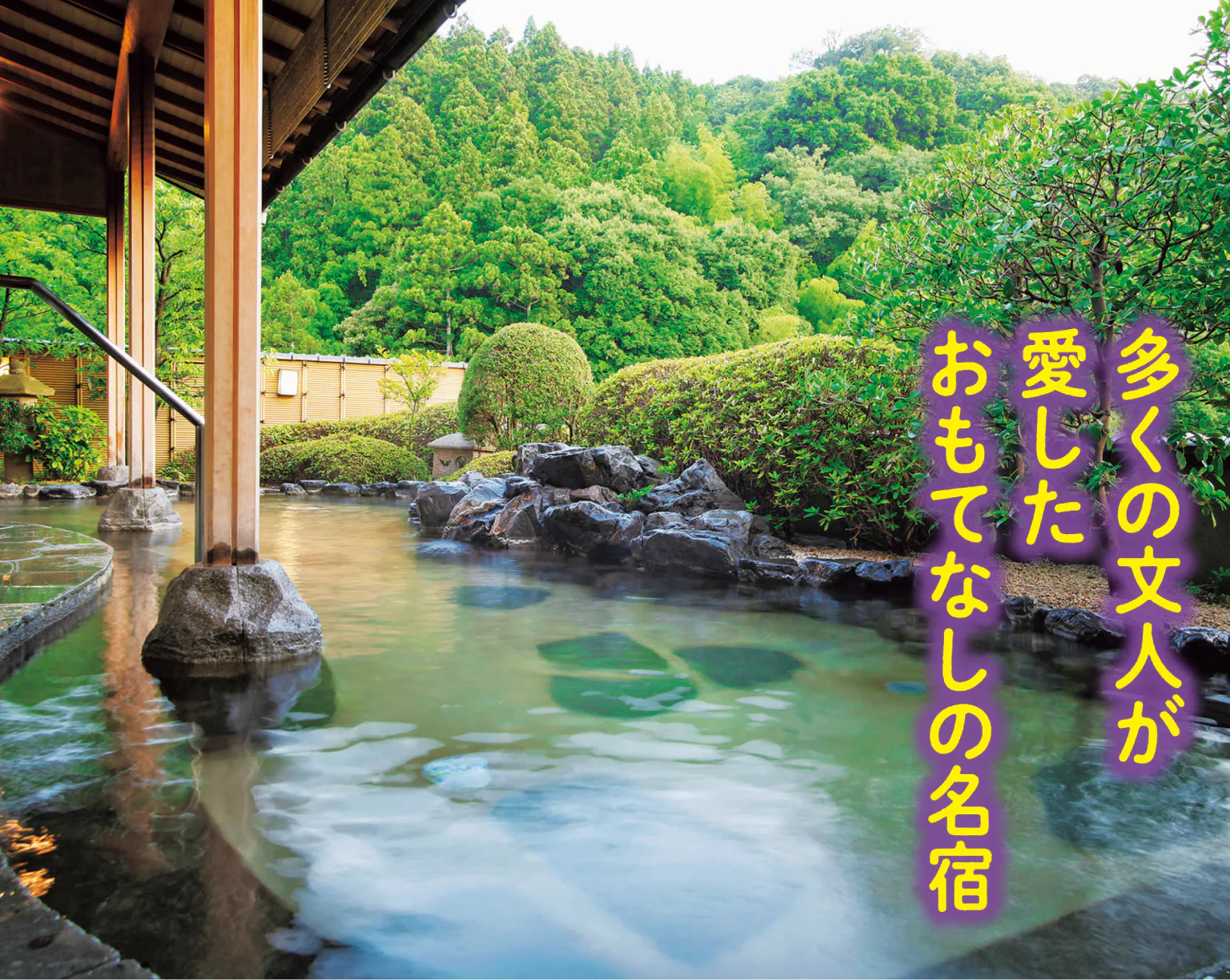 棟方志功や松本清張なども逗留した名宿。開放感あふれる展望露天風呂「天遊の湯」や癒やし処の施設、山陰の幸を使った料理などで心も体も癒やしてくれる。