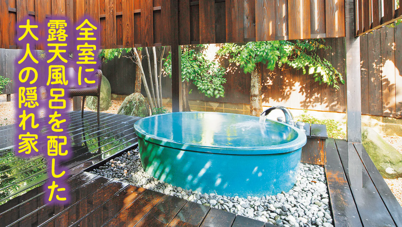 24室の客室はすべて露天風呂付き。信楽焼の露天風呂や檜の露天風呂が備わる。館内には茶室や島根の地酒を楽しめる「日本酒BAR」、石見神楽を演じる「ご当地楽」のおもてなしなど、島根の文化を存分に体験できる。